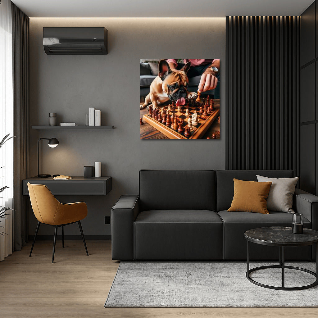 French Bulldog at a chessboard. Living wall art where the pieces seem to be fighting! The perfect poster for playful minds. See more from the collection: Animals Art