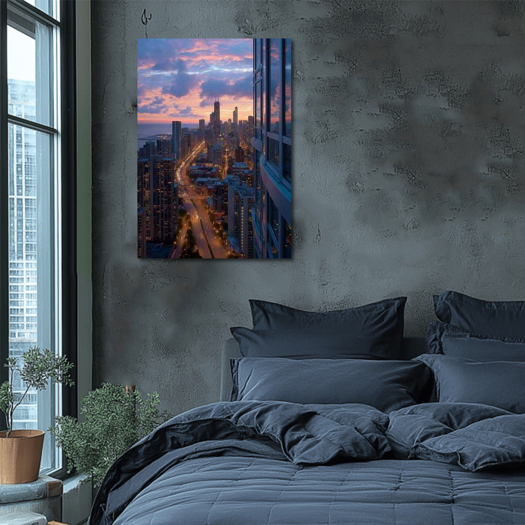 Evening Chicago comes alive in sunset colors. A poster that will become the heart of your wall art. Cityscapes Skylines. See more from the collection: Chicago, USA Art