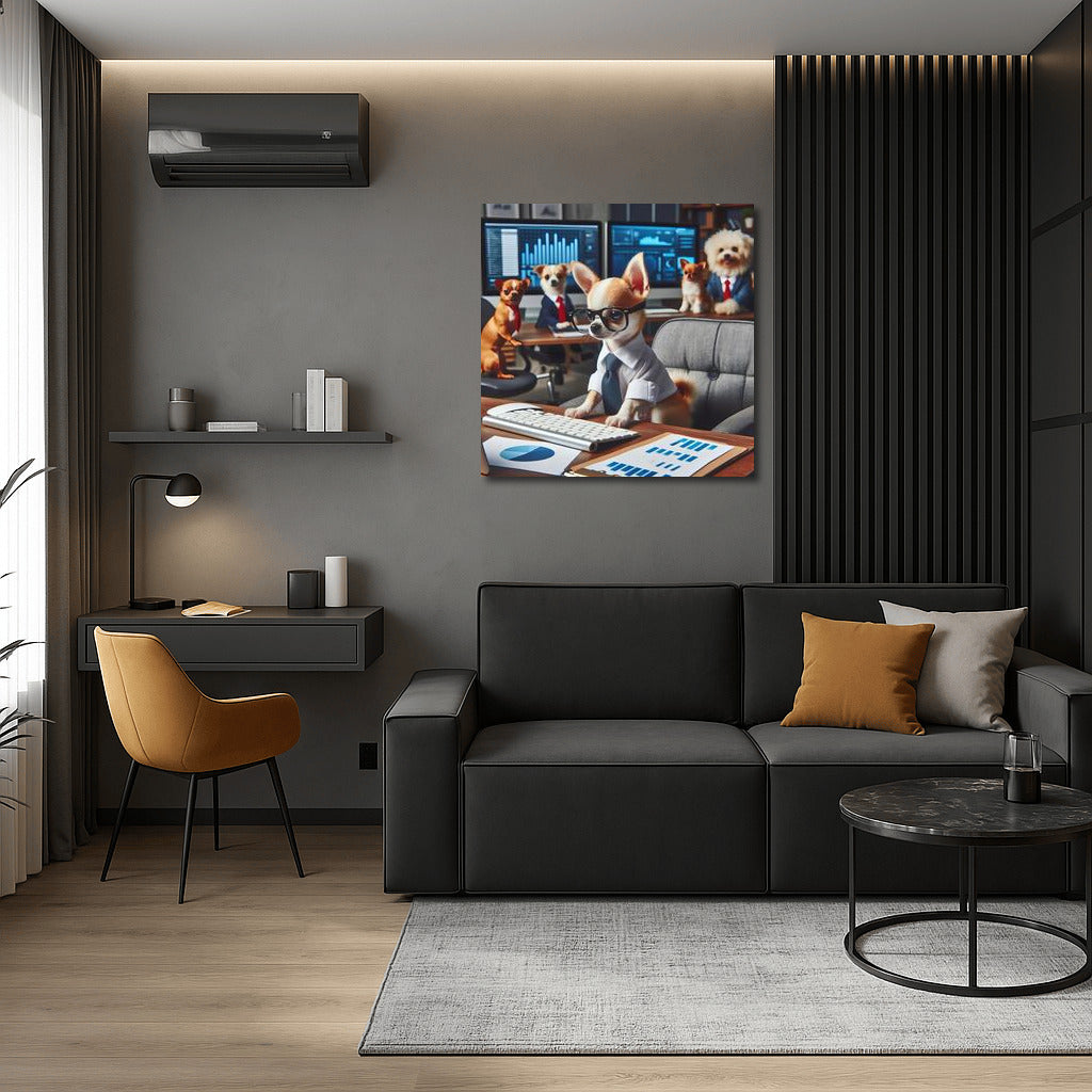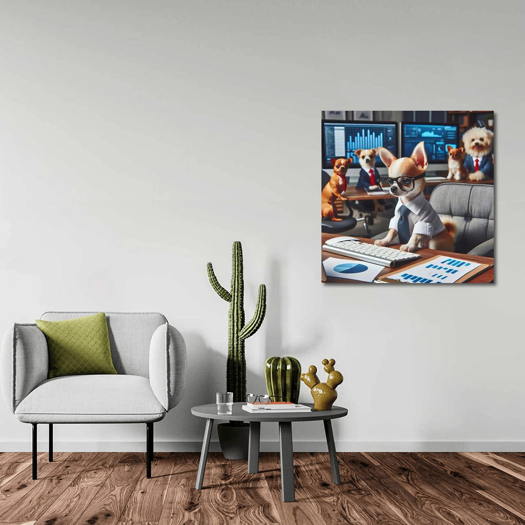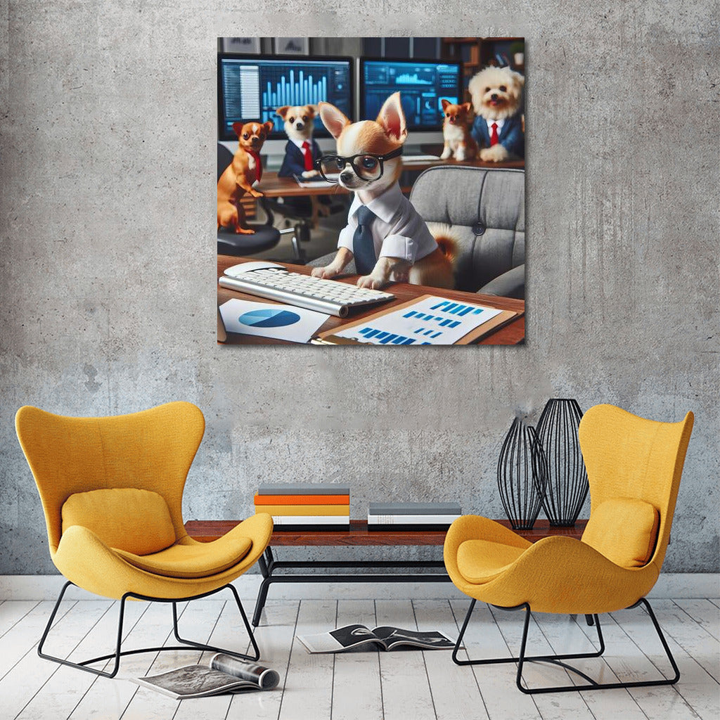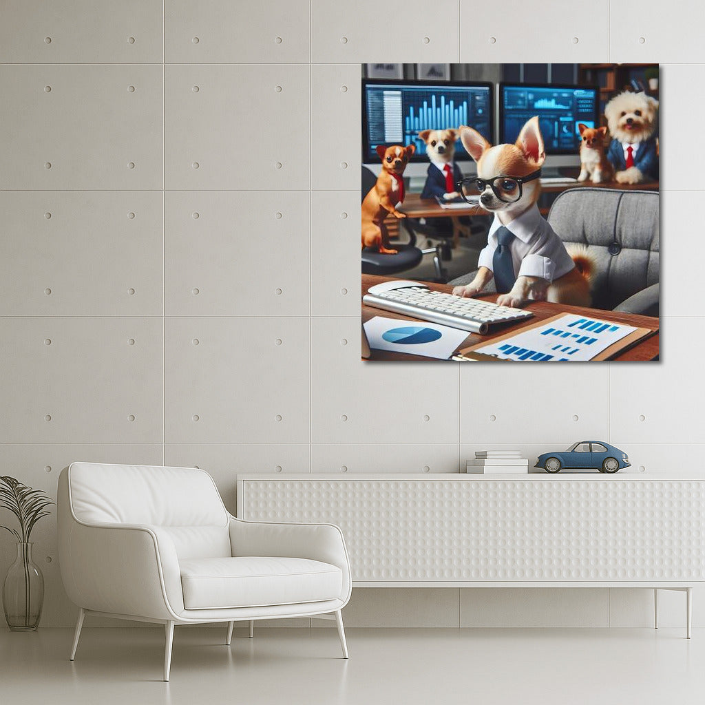 Chihuahua in a suit working in an office at a computer - funny wall art for a stylish interior! See more from the collection: Animals Art