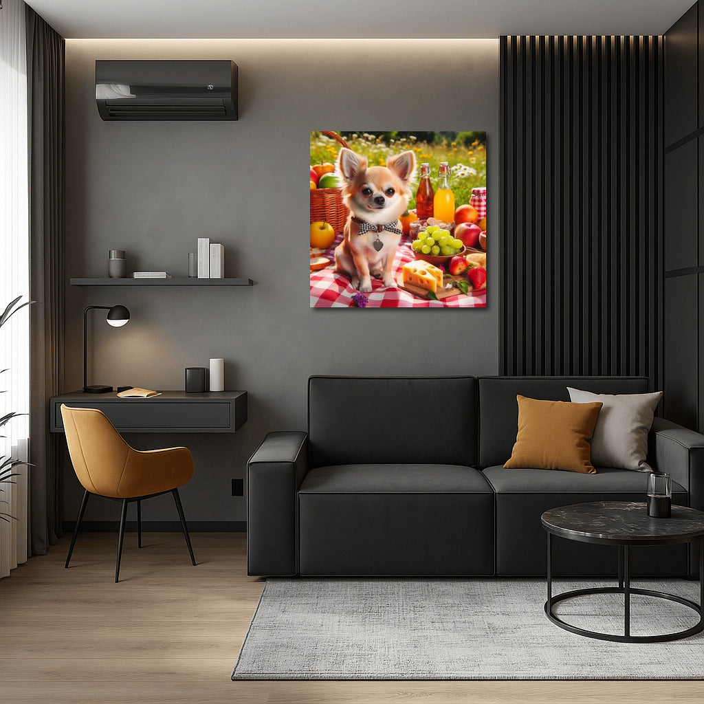 Picnic idyll: a Chihuahua snuggles up on a checkered blanket among fruits and cheese. A charming poster for any wall! See more from the collection: Animals Art