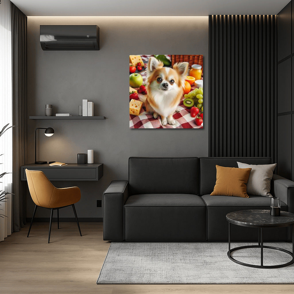 A charming Chihuahua on a picnic among fruits and cheese - a stylish poster for your cozy corner! See more from the collection: Animals Art