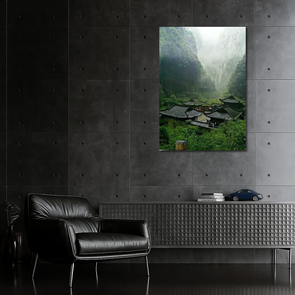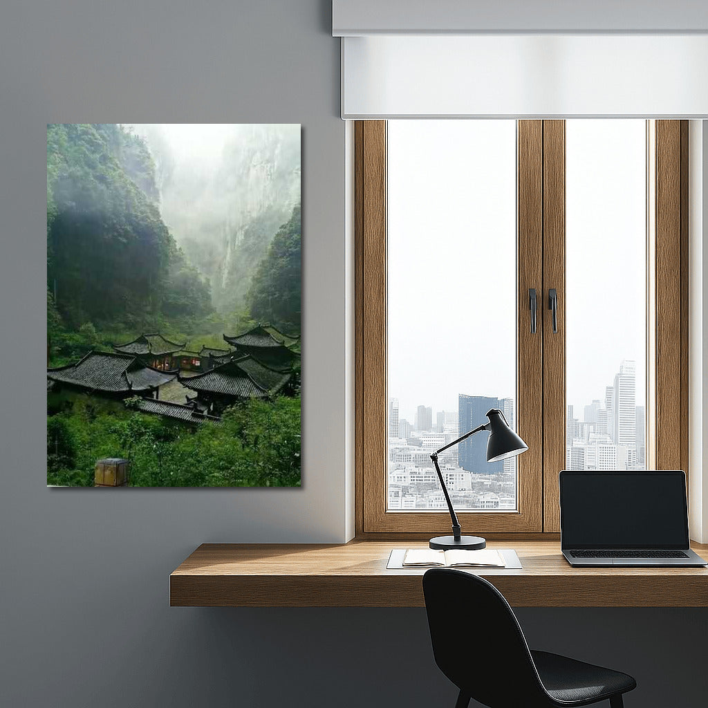 The magic of China in your home: a poster with a misty valley and traditional roofs takes you to a world of harmony and nature. See more from the collection: China Art