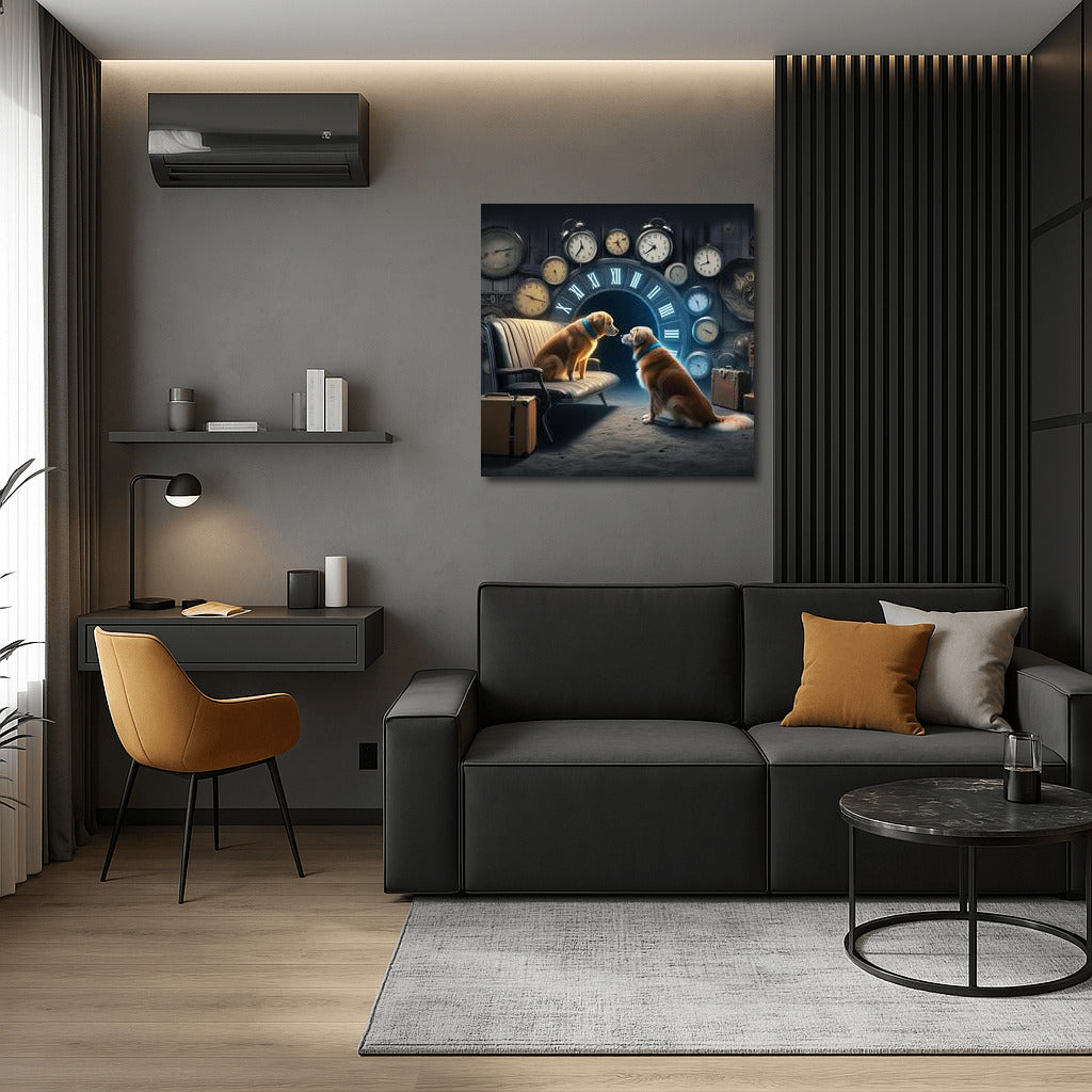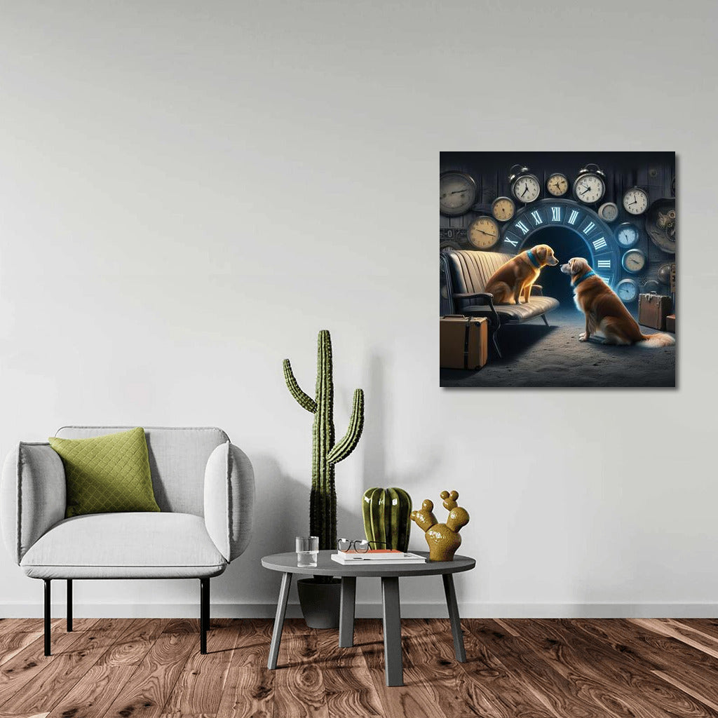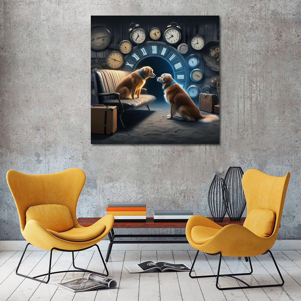 Magical poster: a dog travels through time, meeting himself in different eras. Wall art for dreamers! See more from the collection: Animals Art