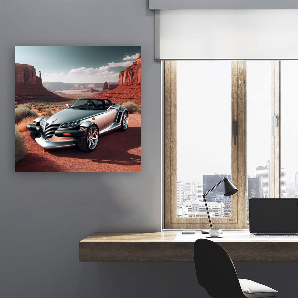 Imagine a killer poster of a Chrysler Prowler tearing through a canyon. This wall art is like an adrenaline rush in your bachelor pad. A painting that screams speed and daring, it gets your heart pumping. Pure thrill for car fans! See more from the collection: Chrysler Art