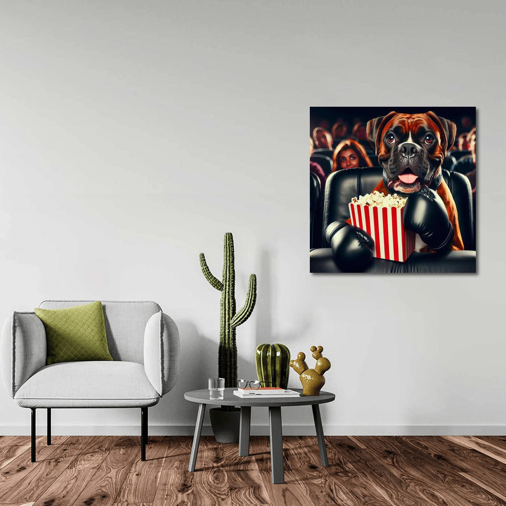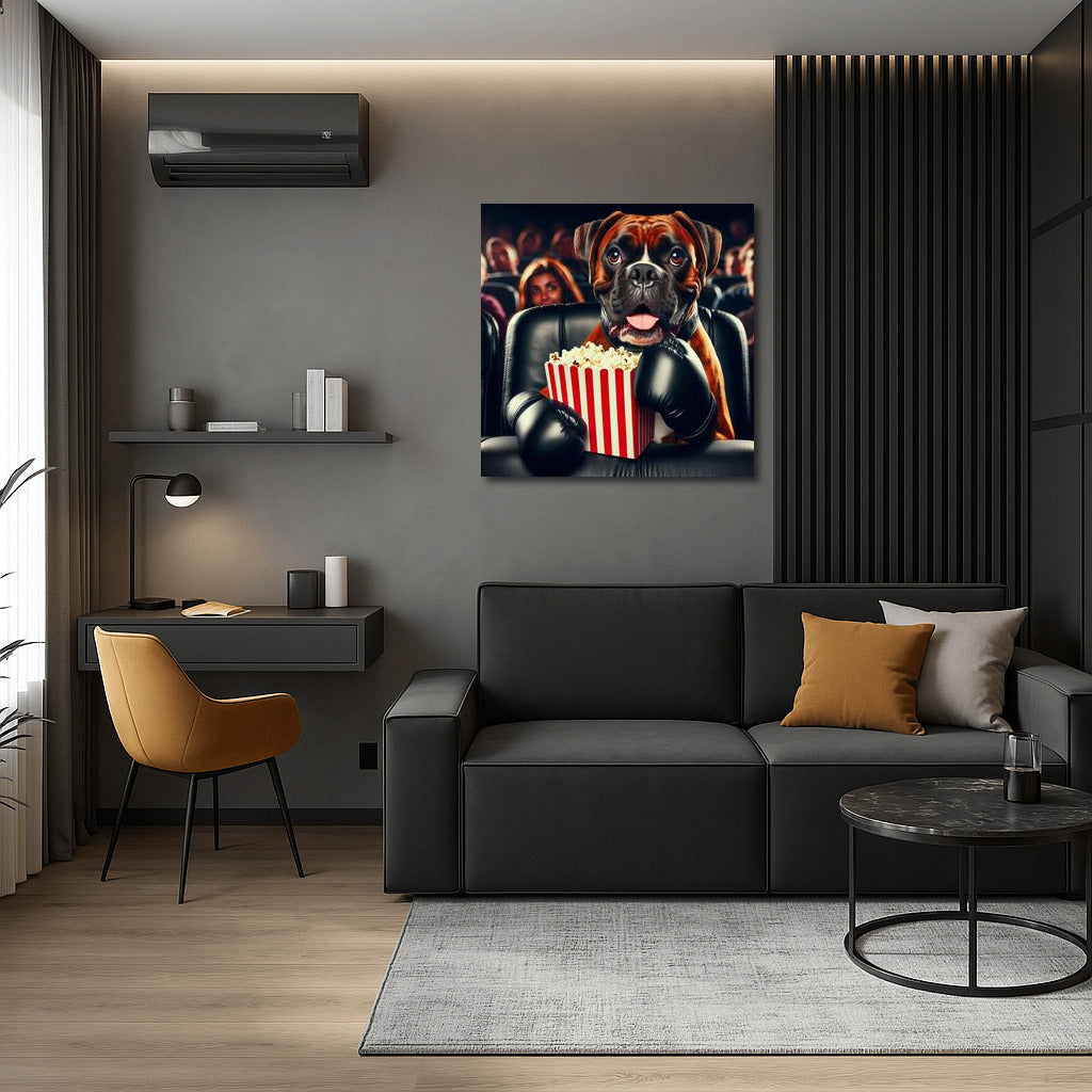 Incredible poster: a boxer enjoying a movie with popcorn in a cinema. Original wall art for humor lovers! See more from the collection: Animals Art