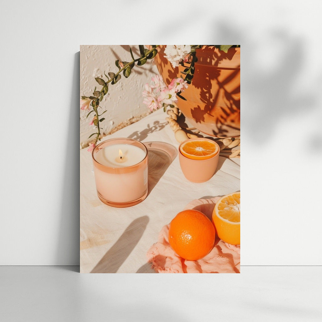Sunny wall poster: the lightness of the morning, the freshness of citrus and the coziness of a candle will enliven your interior and give you warmth. See more from the collection: Cozy Interiors Art