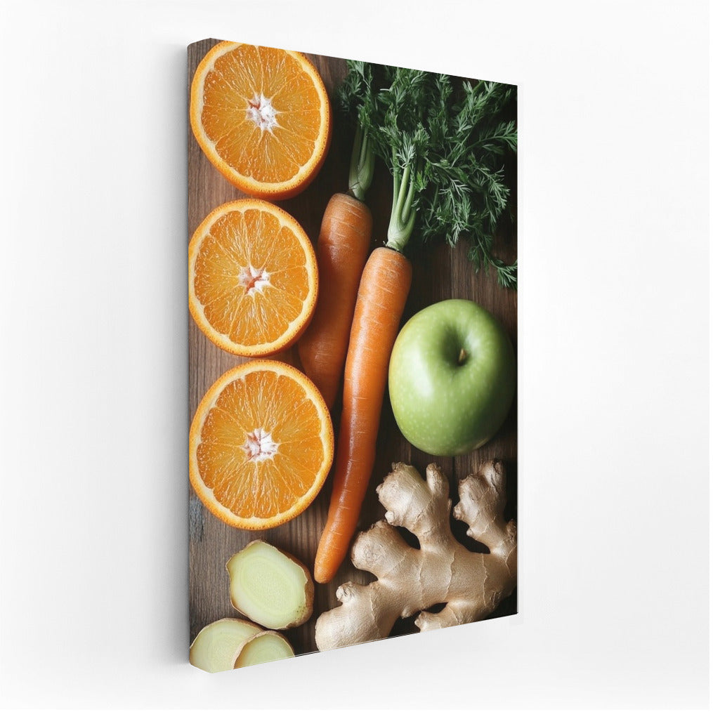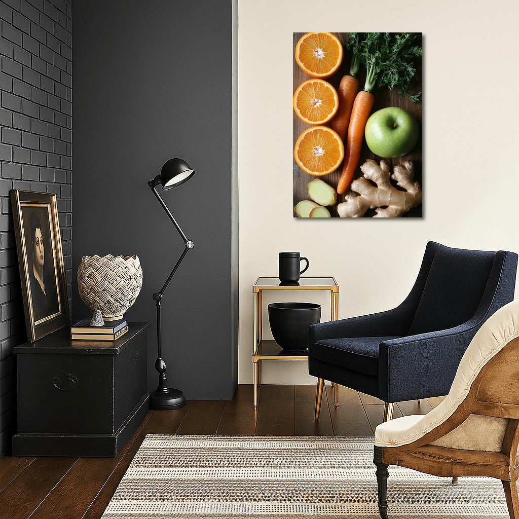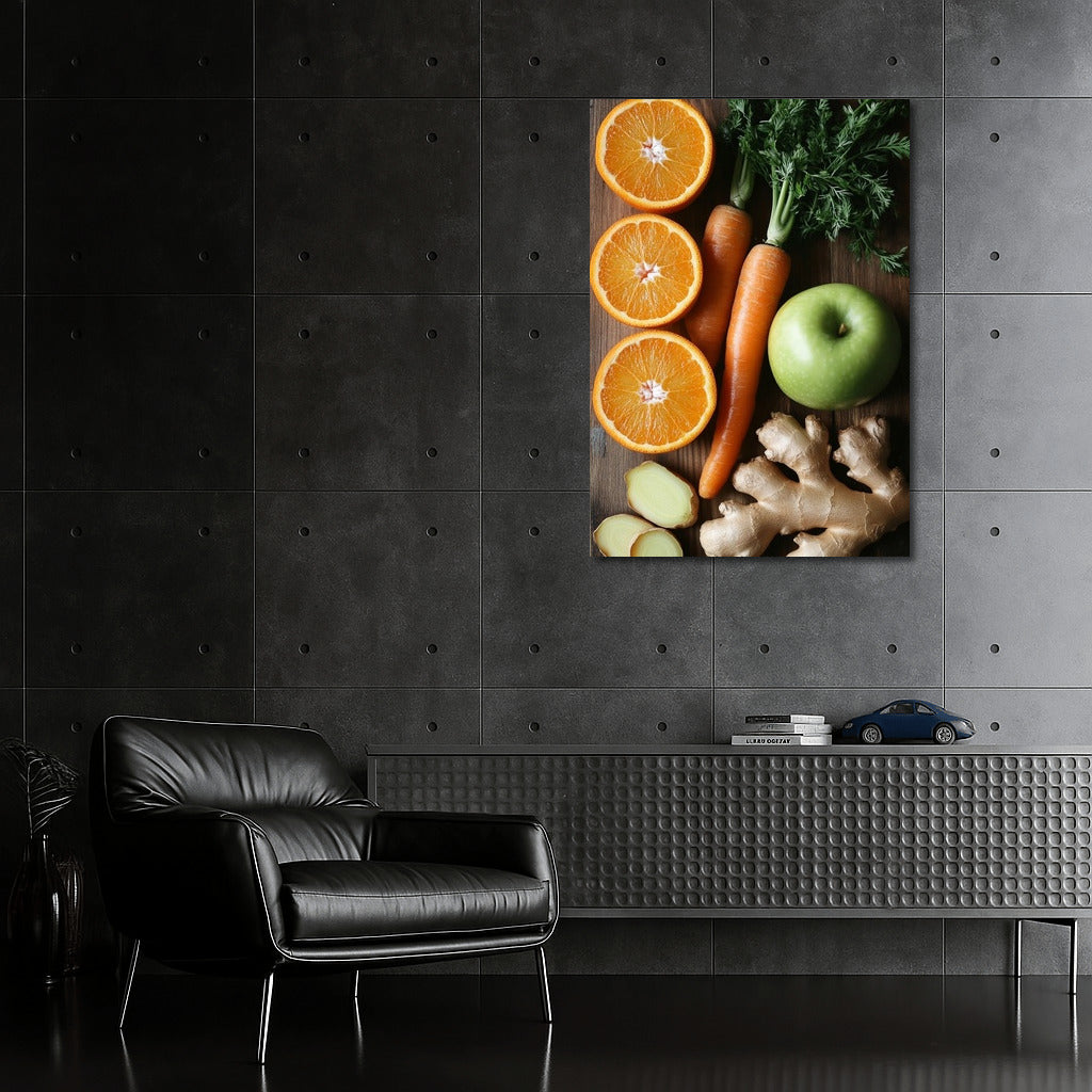 A vibrant poster of fruits and vegetables: oranges, carrots, apple and ginger create a juicy symphony on your wall art. See more from the collection: Food Art