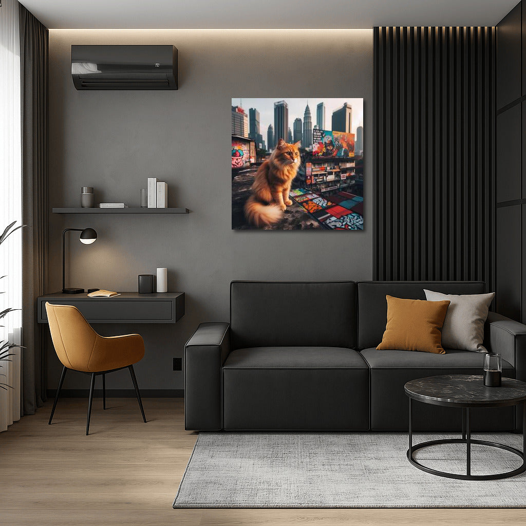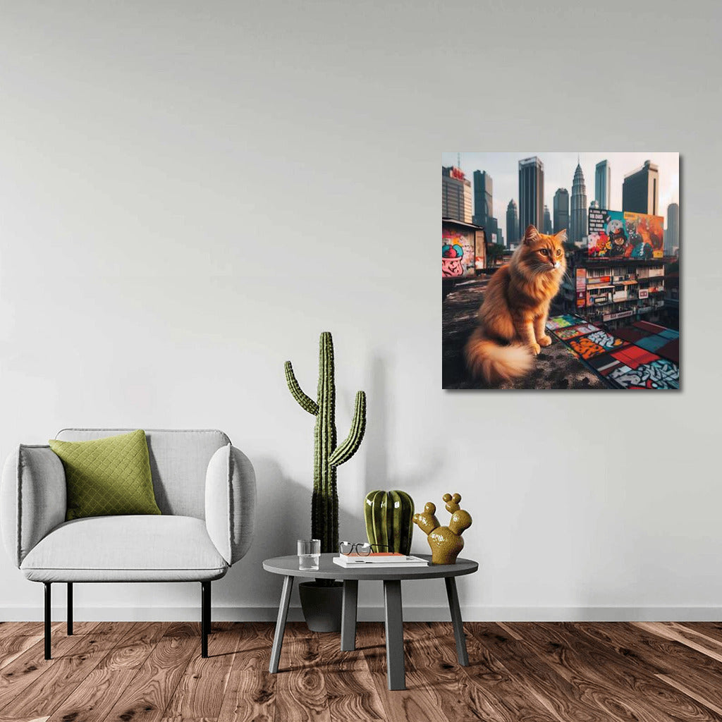 Cat in Urban Rooftop 3 poster: adorable cat against the backdrop of urban high-rises and graffiti. Perfect wall art! See more from the collection: Animals Art