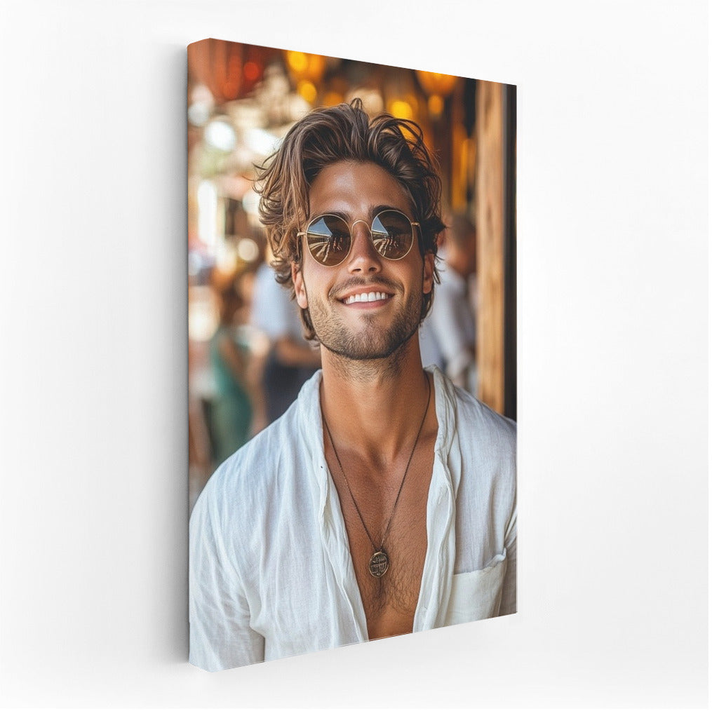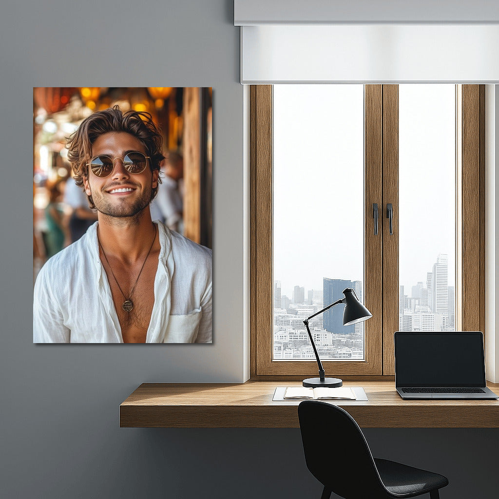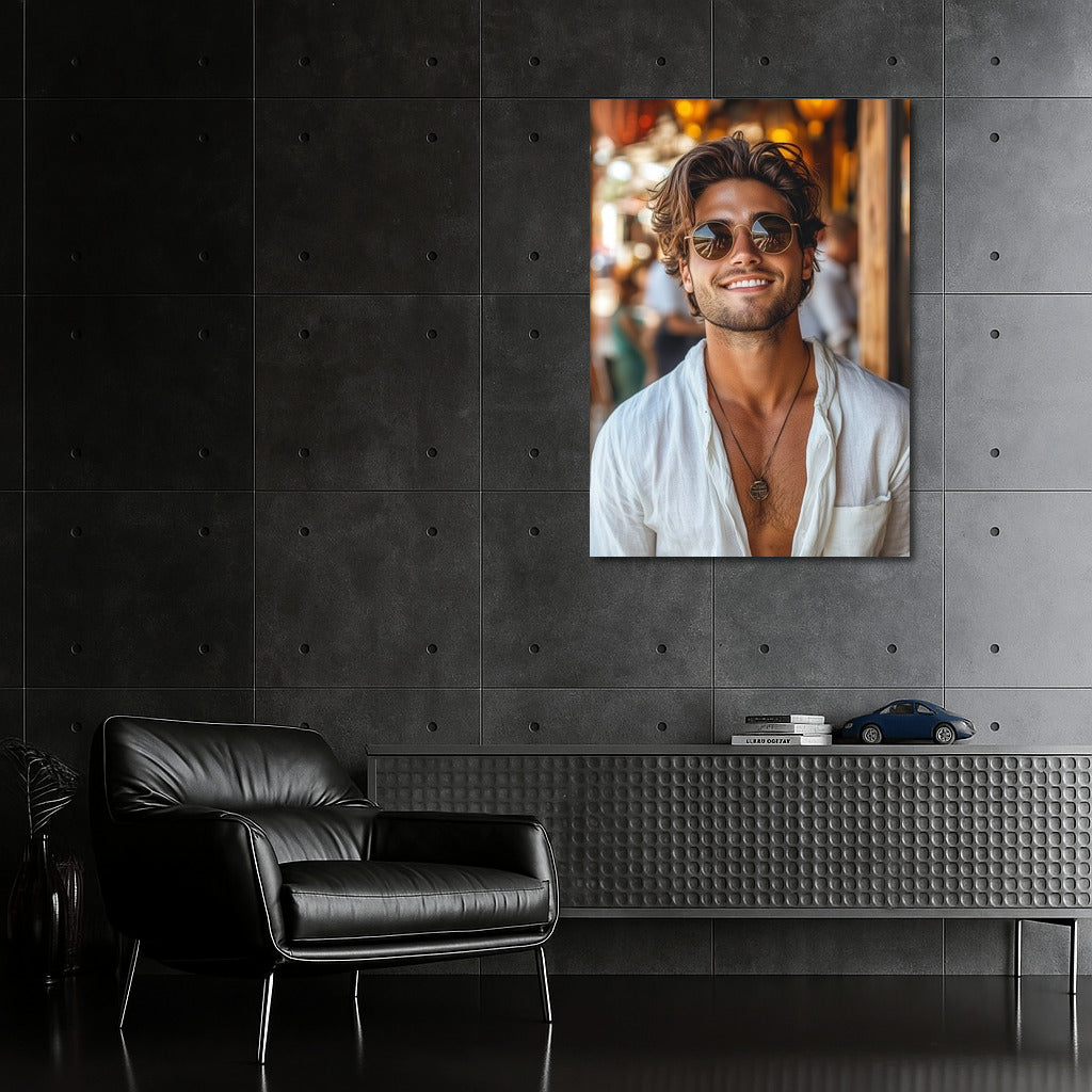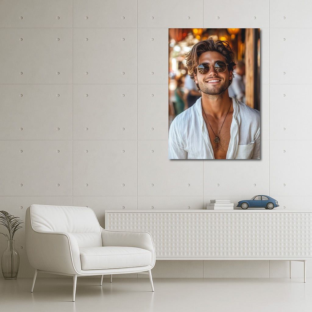 Image of a man with glasses and a white shirt. Stylish wall art with a light mood and charm of city streets. See more from the collection: Mixed Wall Art