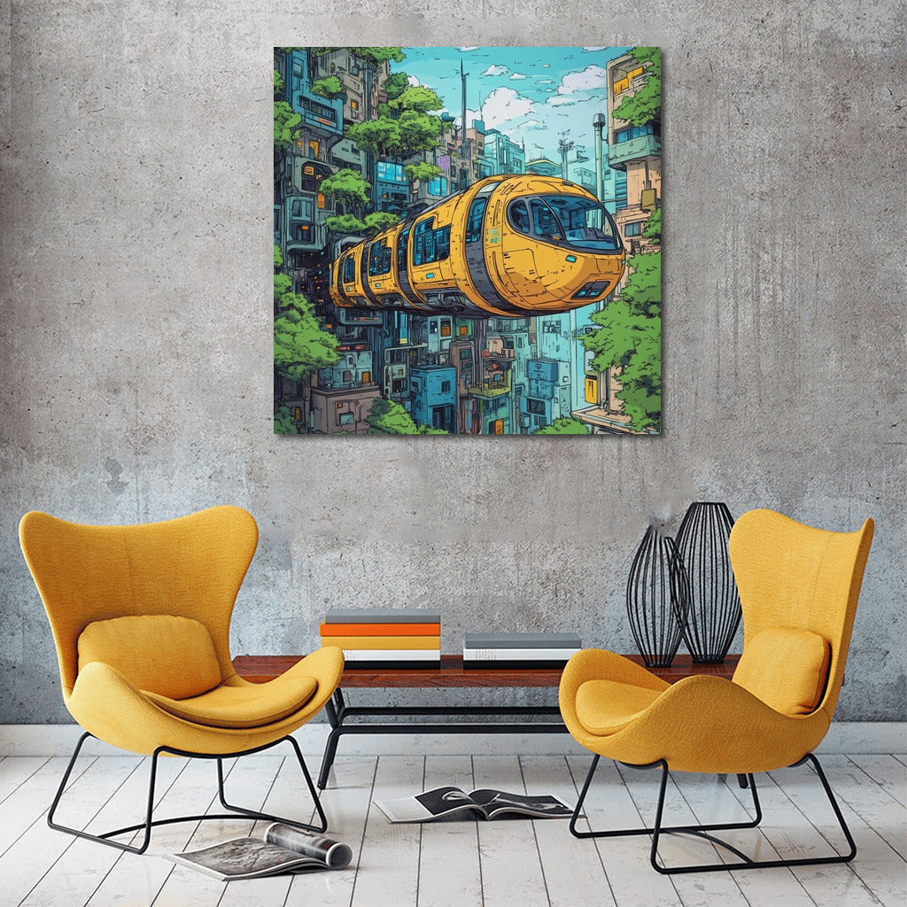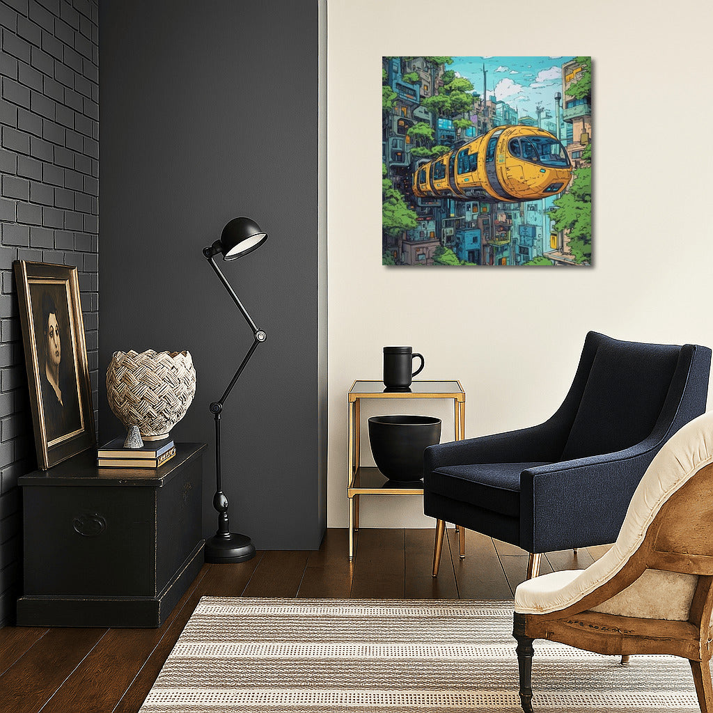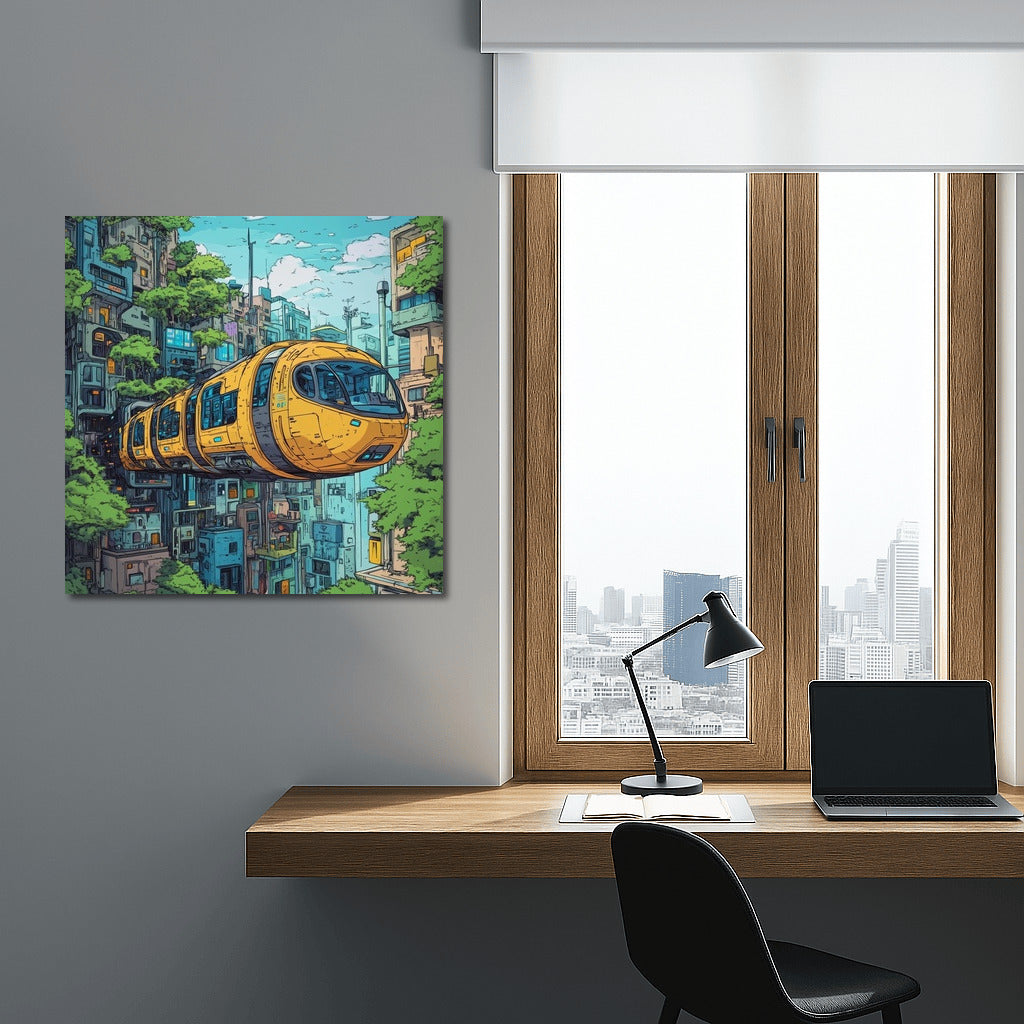 Futuristic poster: hovering train through urban jungle. Wall art that brings life to your walls! See more from the collection: Futurism Art