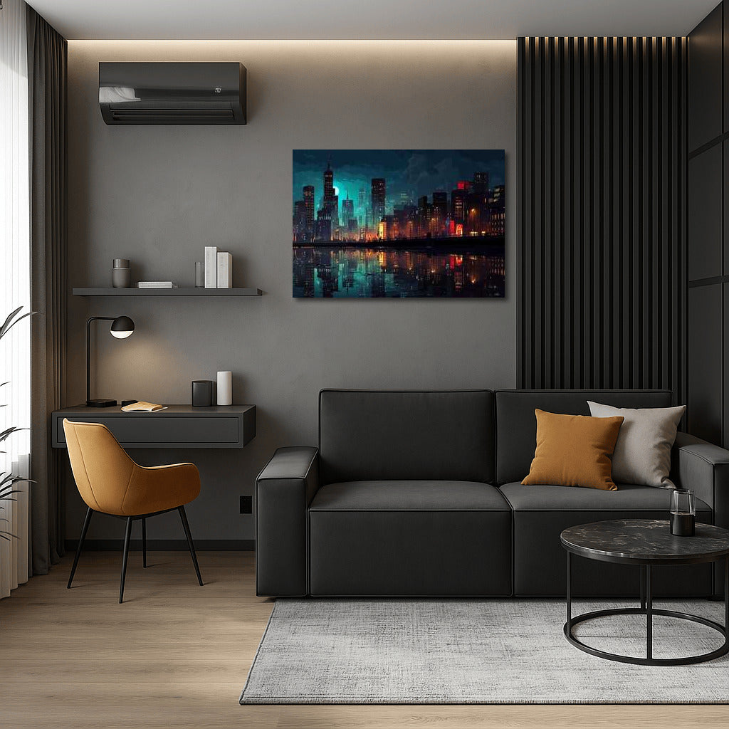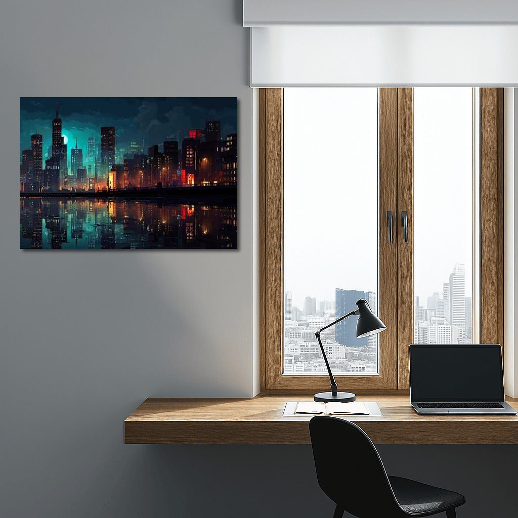 Night magic of the metropolis: immerse yourself in the glow of the horizon with this atmospheric painting for your interior. Wall art. See more from the collection: City at Night Art