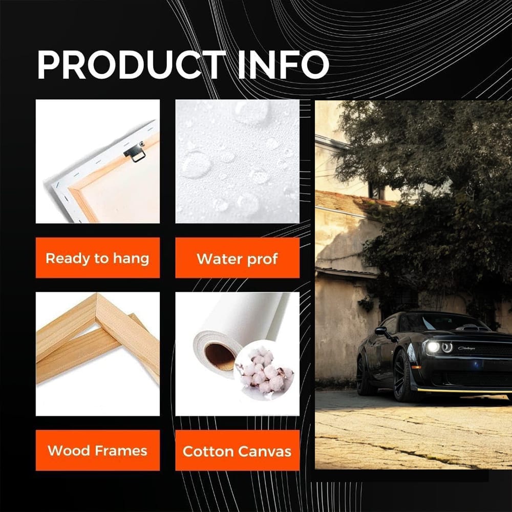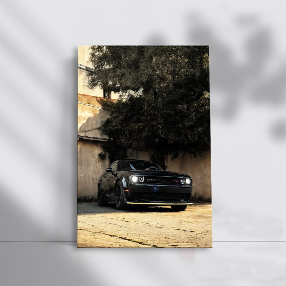 This painting is a true masterpiece for those who understand cars. A poster of an old school Dodge Challenger in front of an old house is the perfect wall art for a garage or a man cave. One look at it and you are immediately behind the wheel of a legend! See more from the collection: Dodge Art