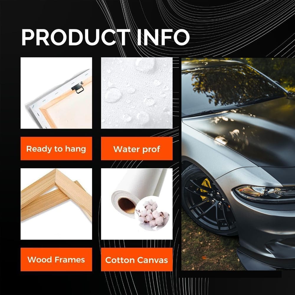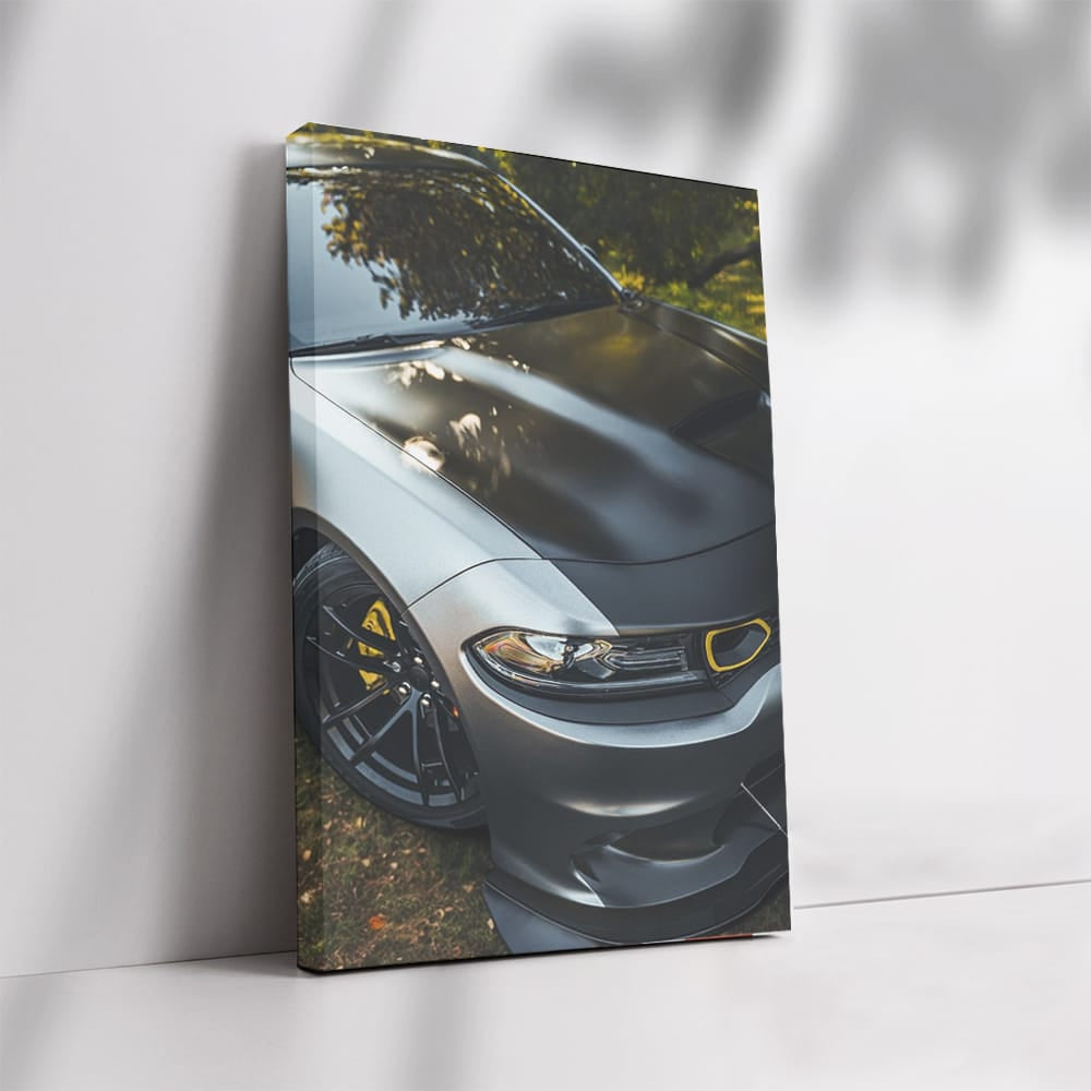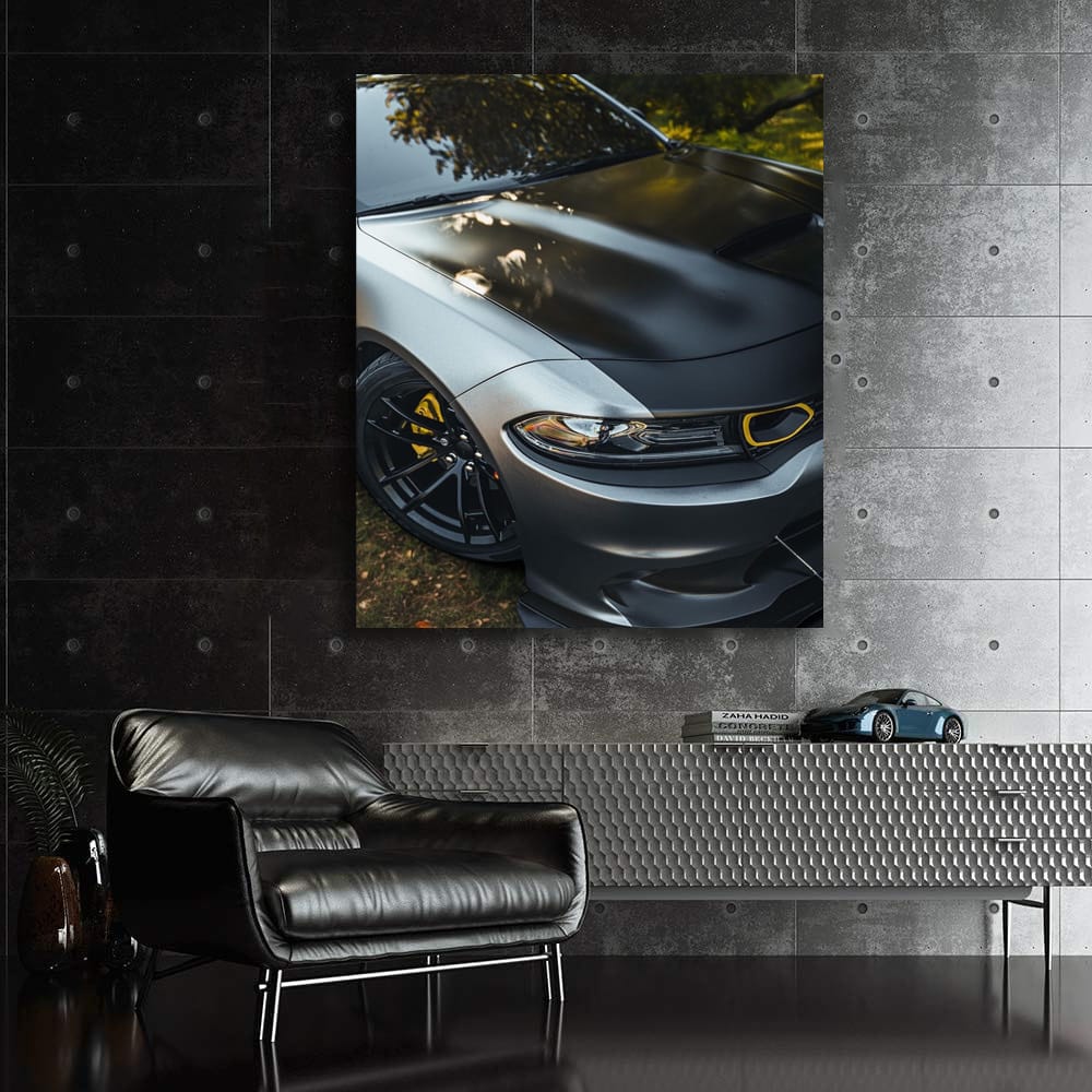 Well, guys, take a look at this poster: Dodge Charger in the garden, like a king on the throne. This wall art screams speed and freedom. A painting for those who like horses under the hood, not under the saddle. See more from the collection: Dodge Art