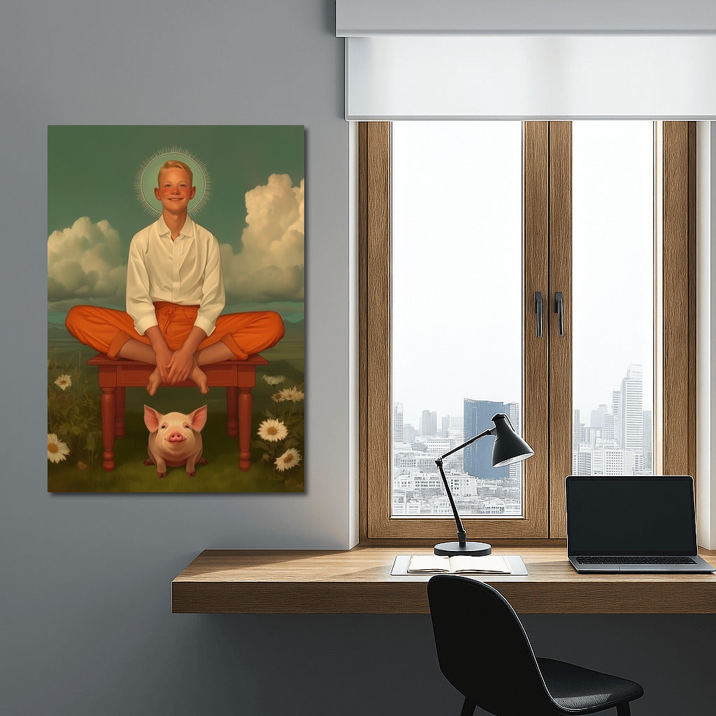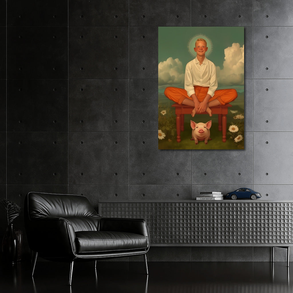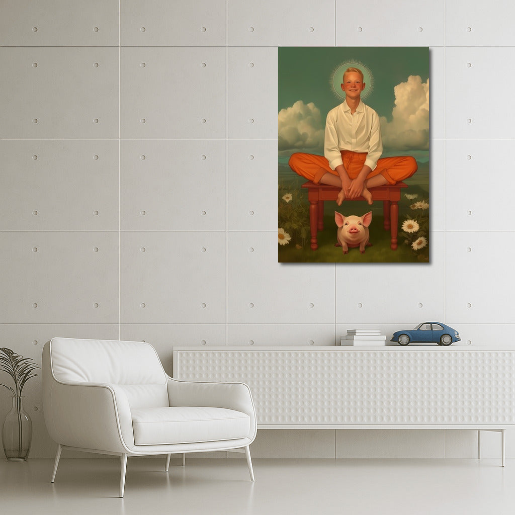 Magical poster: neutral figure in clouds, above flowers and a pig. Vibrant palette for unique wall art! See more from the collection: Mixed Wall Art