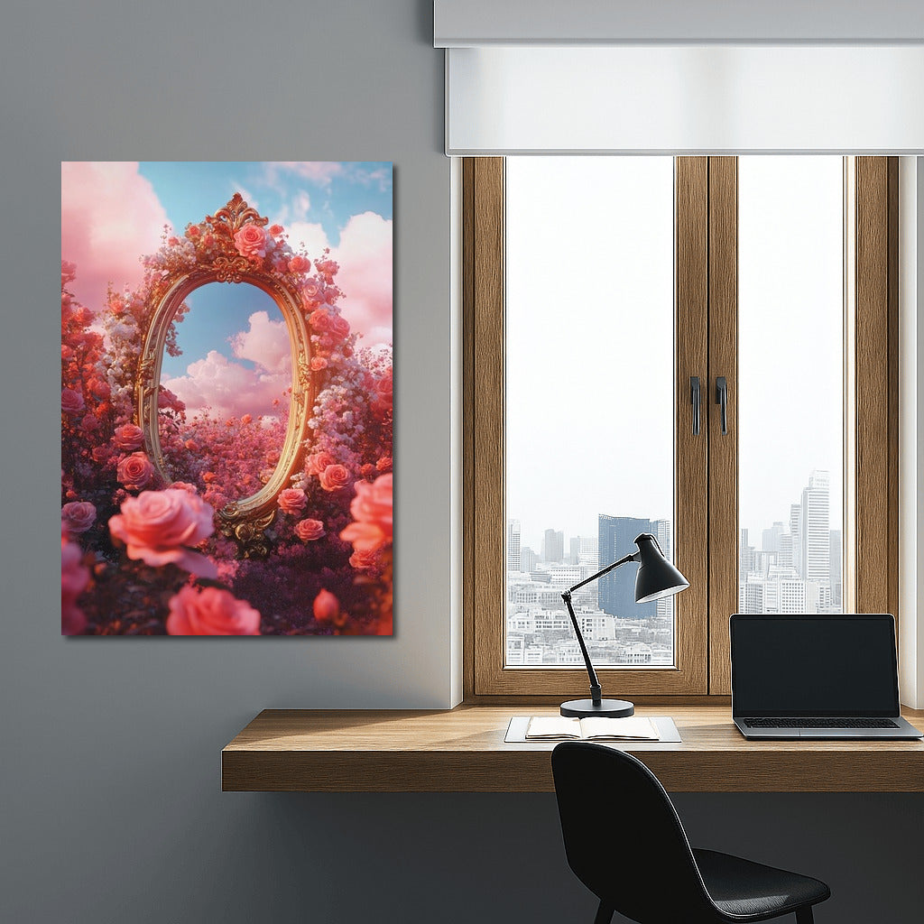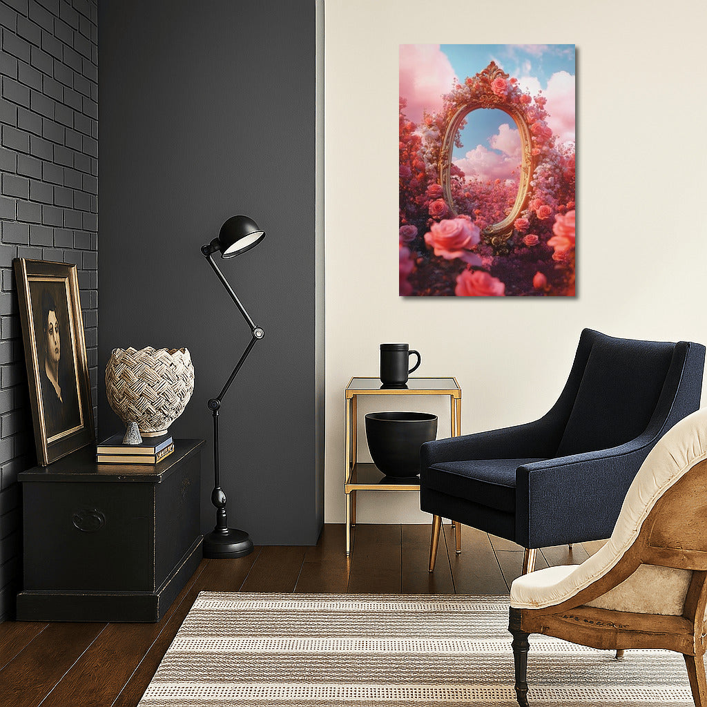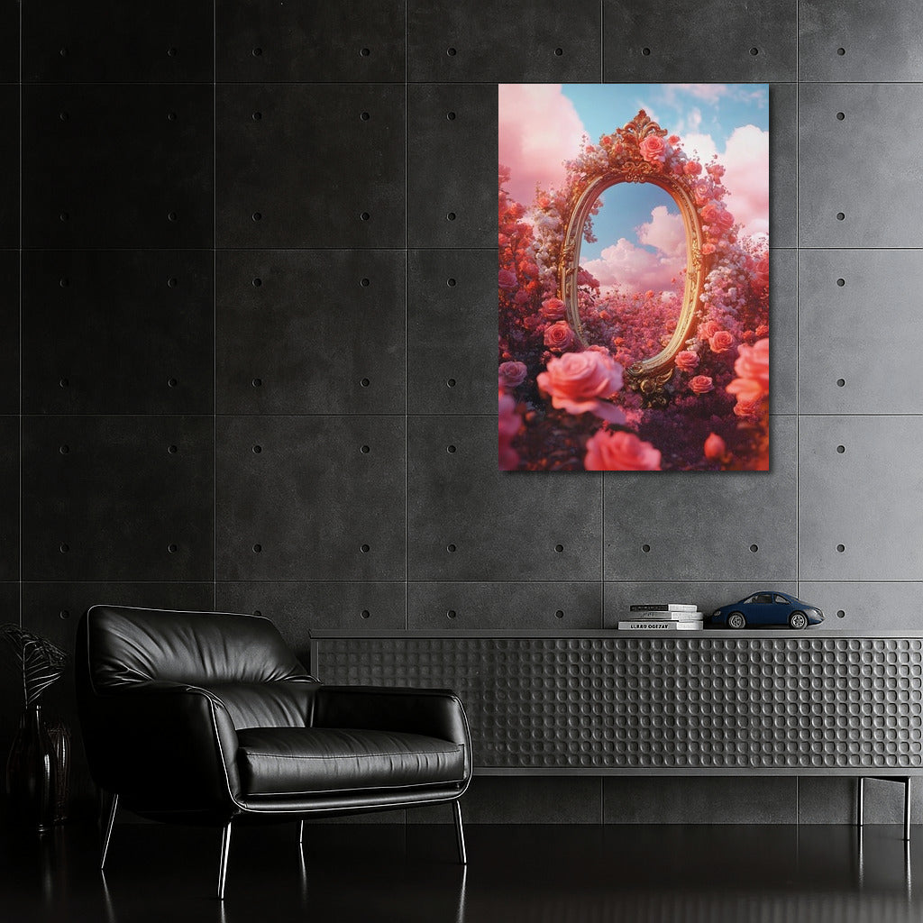 Mirror in the Kingdom of Roses: A magical poster where clouds meet the floral world. Wall art for dreamers. See more from the collection: Mixed Wall Art