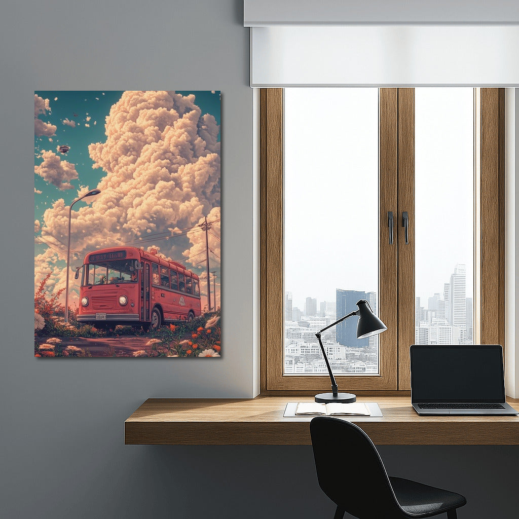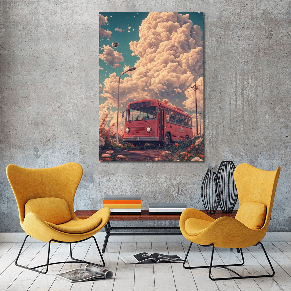 A vibrant poster of a retro bus under the clouds. Wall art that takes you into the atmosphere of dreamy travels. See more from the collection: Anime & Manga genres Art