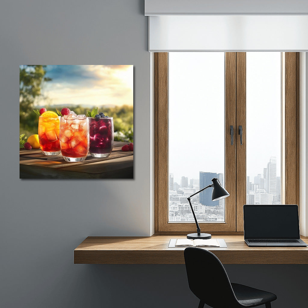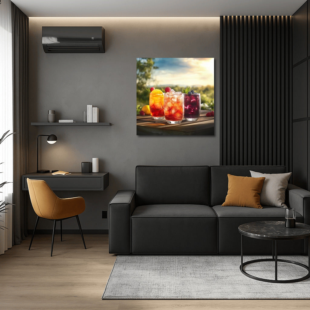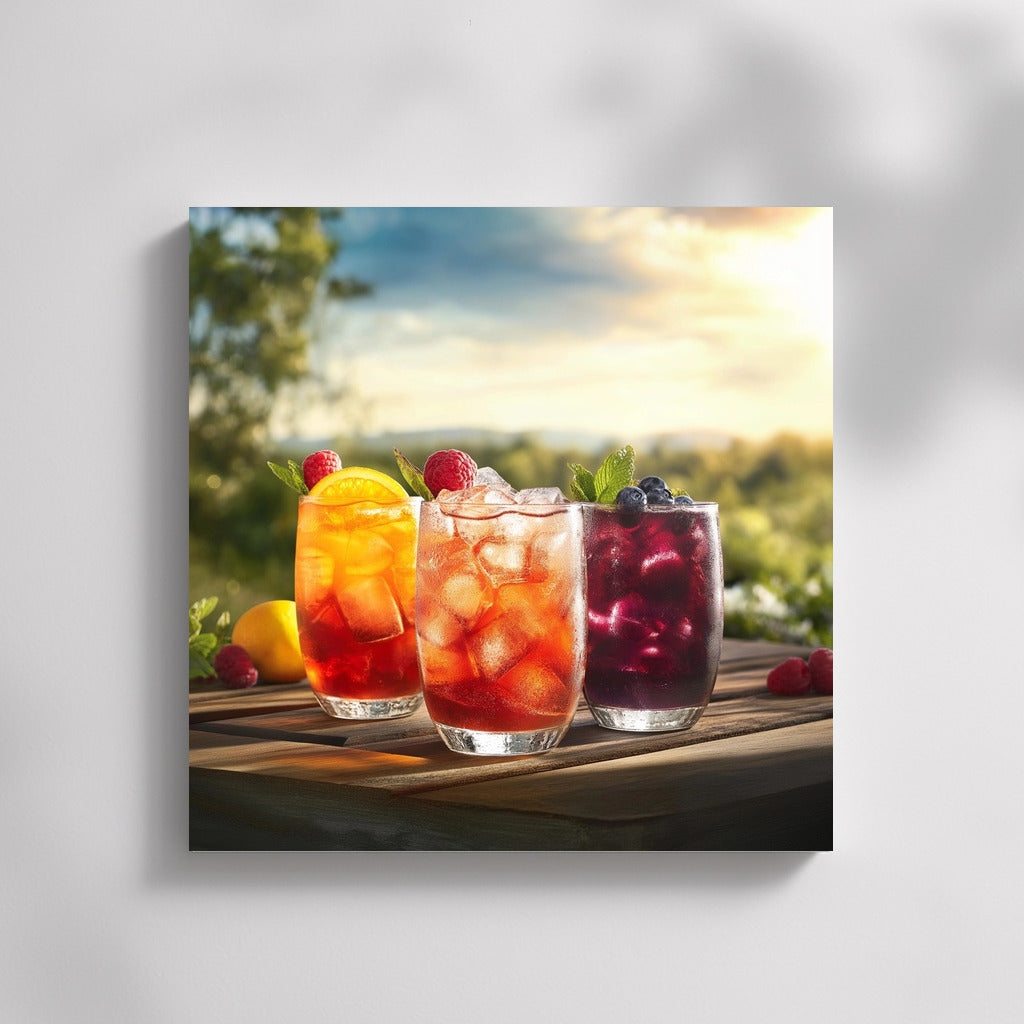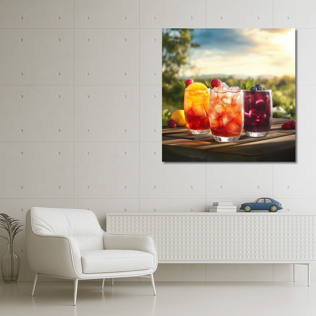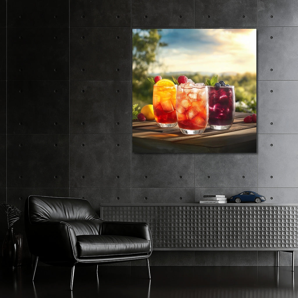 A painting poster with colorful drinks against a natural backdrop - refresh your interior with unique wall art full of summer and taste! See more from the collection: Coffee & Tea Art & Drinks