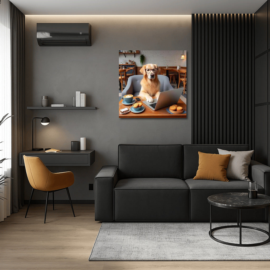 A poster of an adorable dog using a laptop in a cozy cafe. Perfect wall art for those who love humor and coffee breaks! See more from the collection: Animals Art