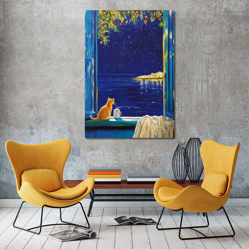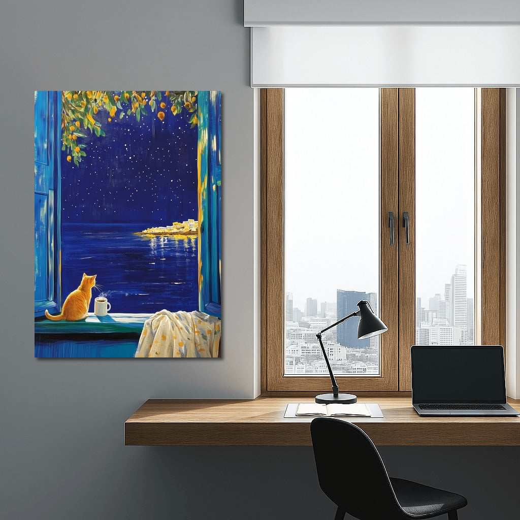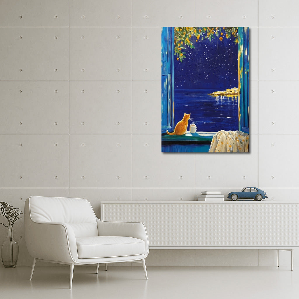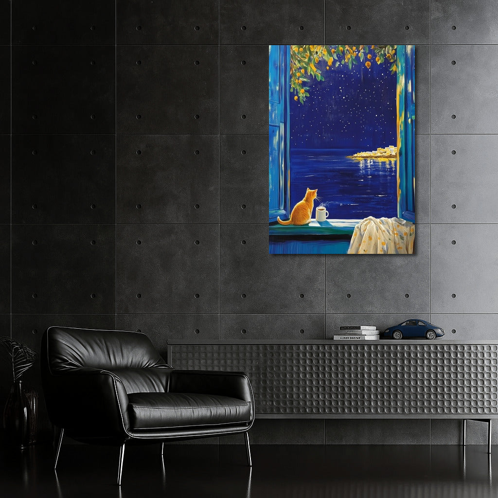 A cat, a night sky and the aroma of coffee - a perfect poster to create a cozy atmosphere. Wall art with a dreamy depth. See more from the collection: Mixed Wall Art