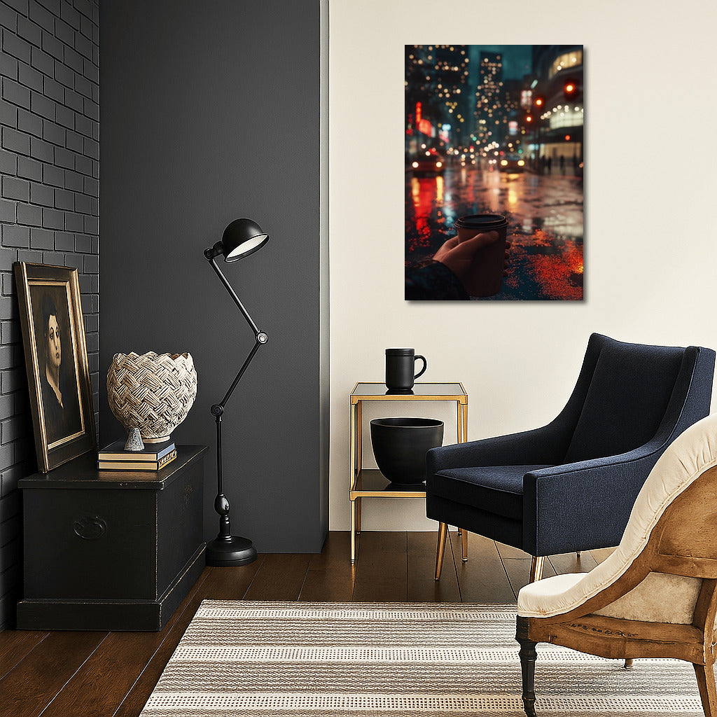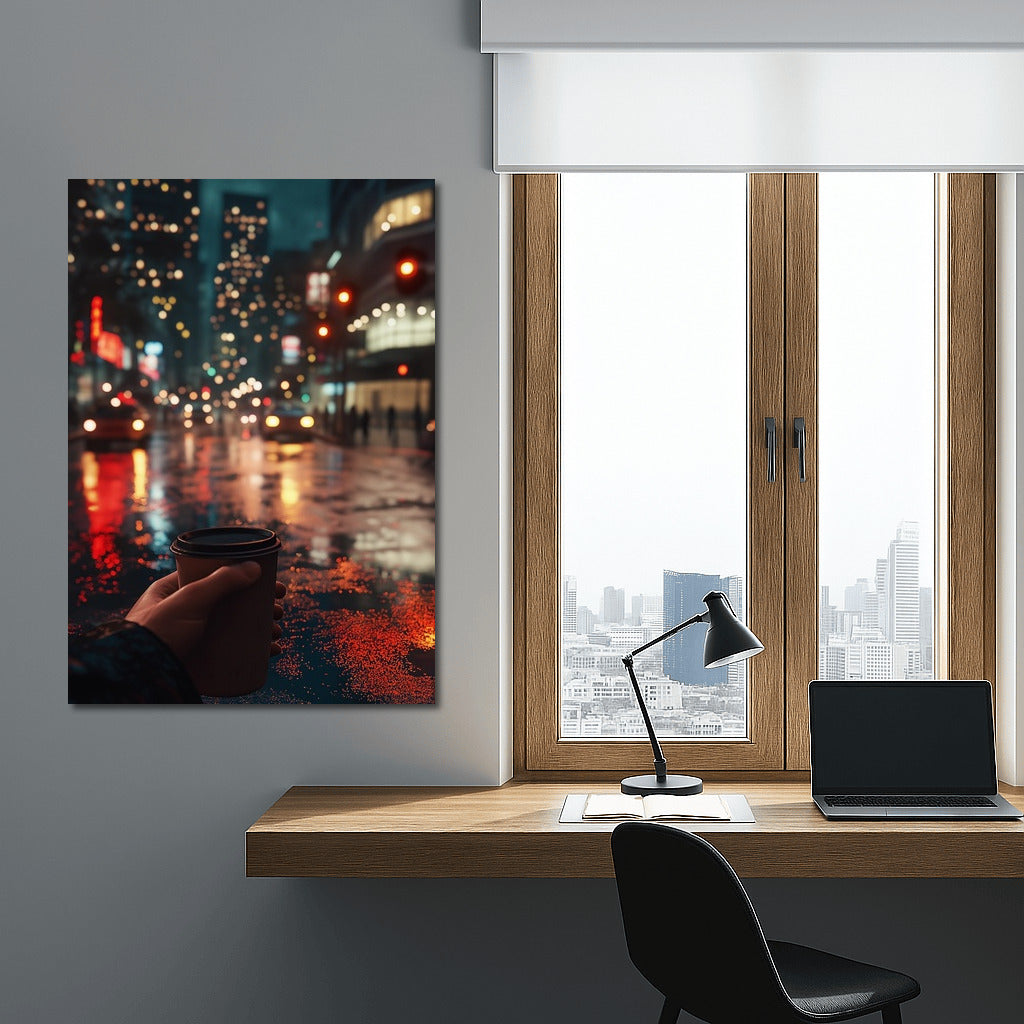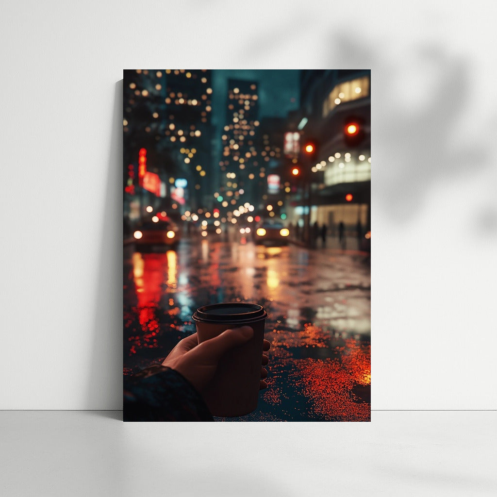 Foggy evening in the city: street lights, rain reflections and a cup of coffee. Atmospheric wall art for coziness and inspiration. See more from the collection: Mixed Wall Art