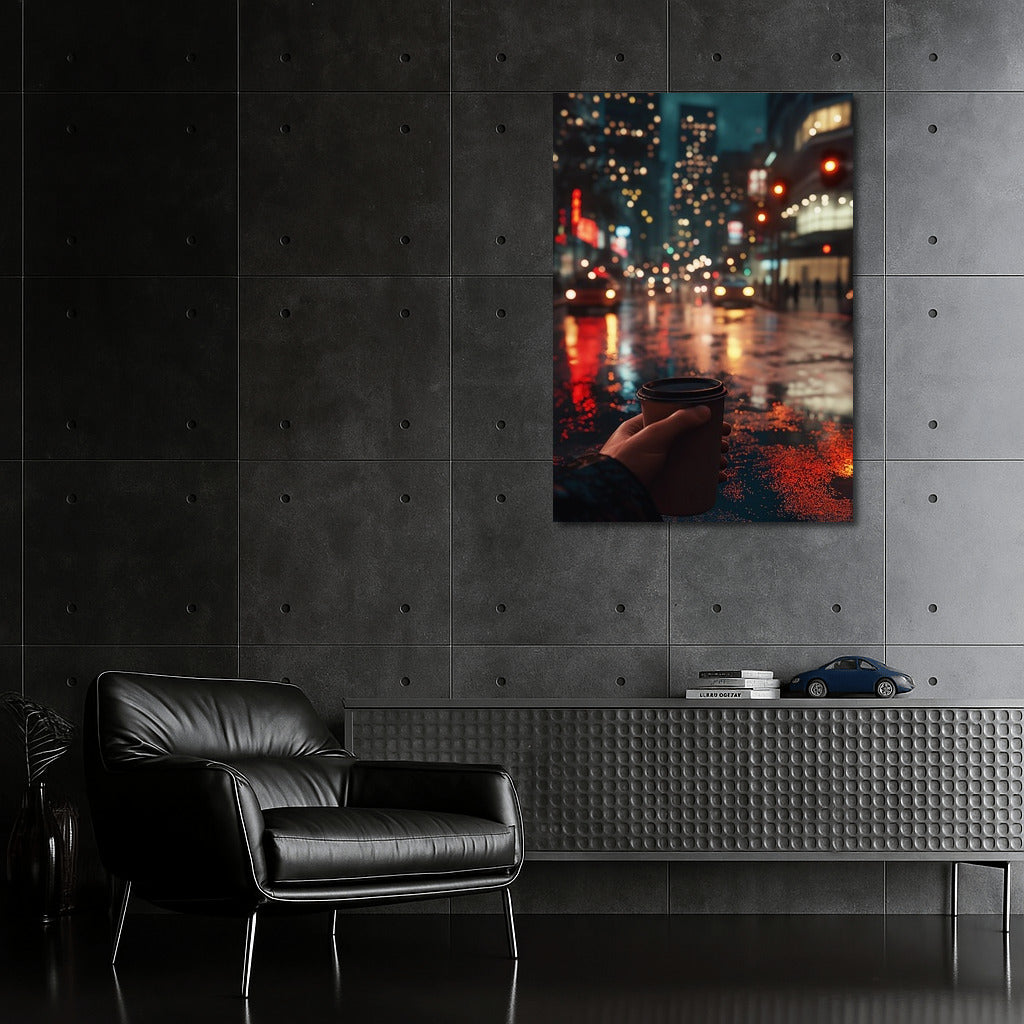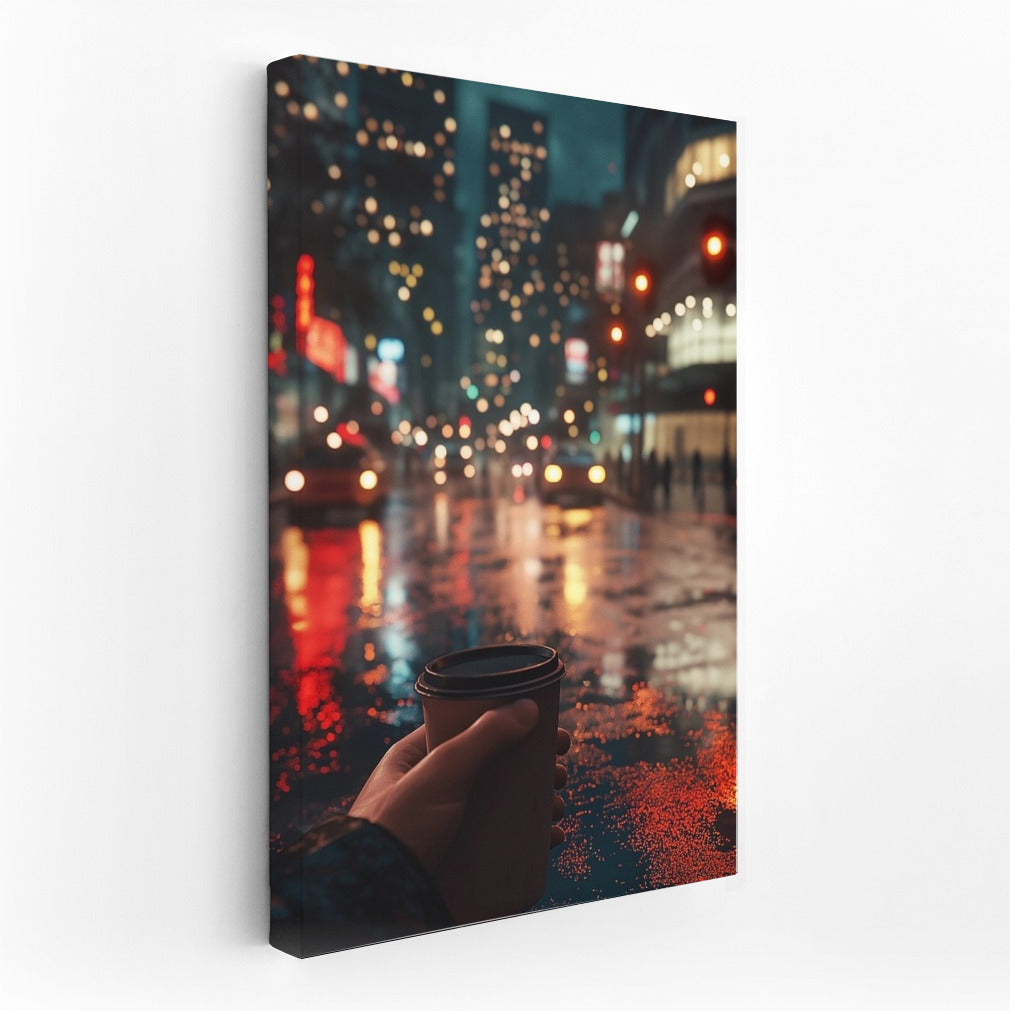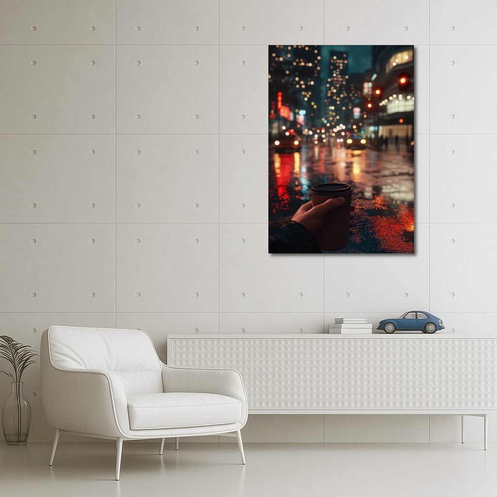 Foggy evening in the city: street lights, rain reflections and a cup of coffee. Atmospheric wall art for coziness and inspiration. See more from the collection: Mixed Wall Art