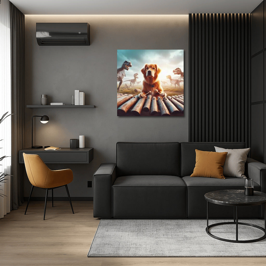 Poster Symphony of the Eras: Dog Conducts Xylophone Made of Dinosaur Bones. Wall Art for Bold Interiors! See more from the collection: Animals Art