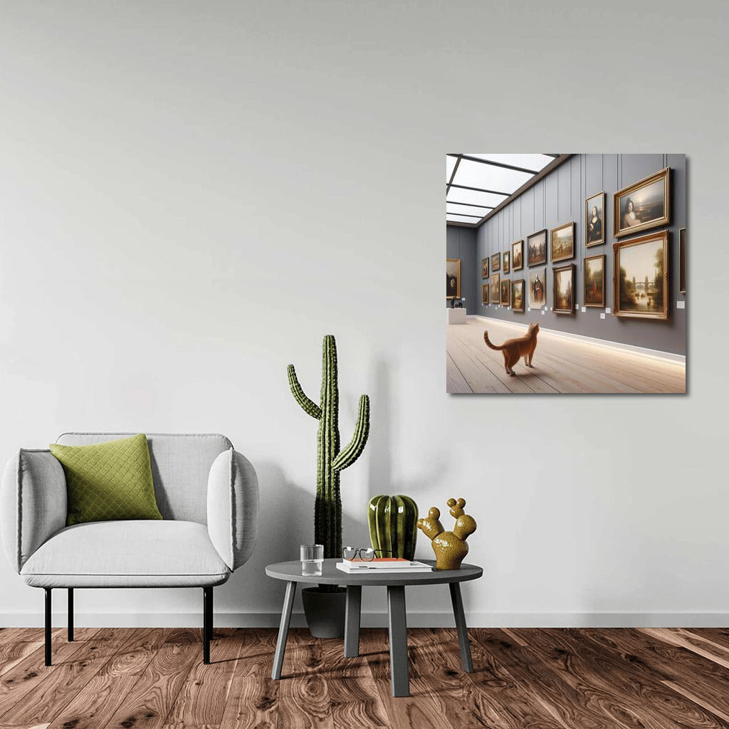 A furry art lover explores a minimalist gallery with outstanding wall art. A poster for lovers of cats and paintings! See more from the collection: Animals Art