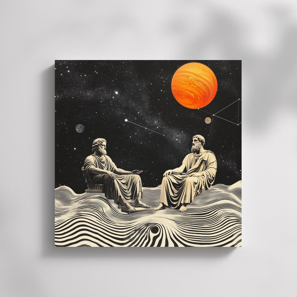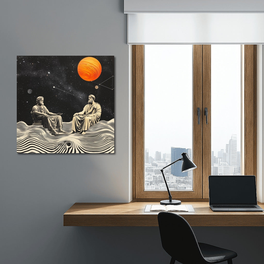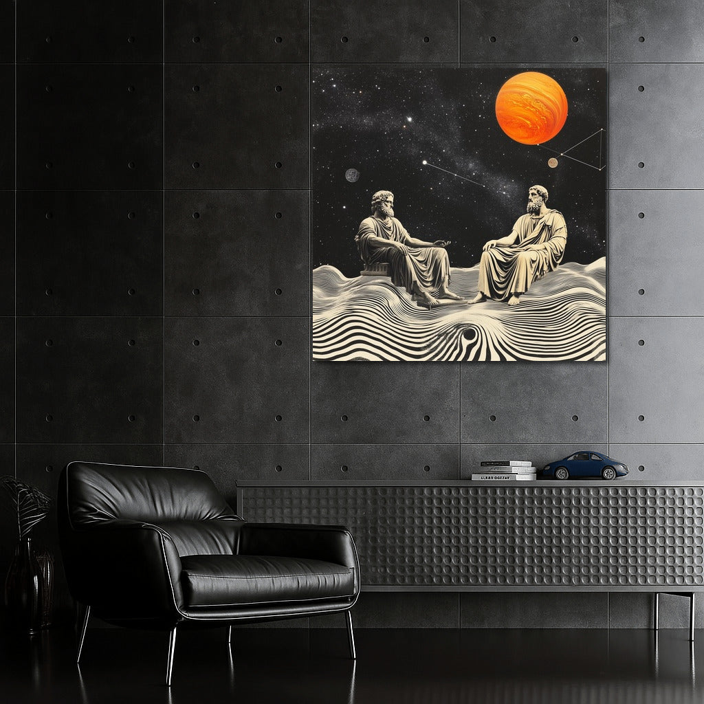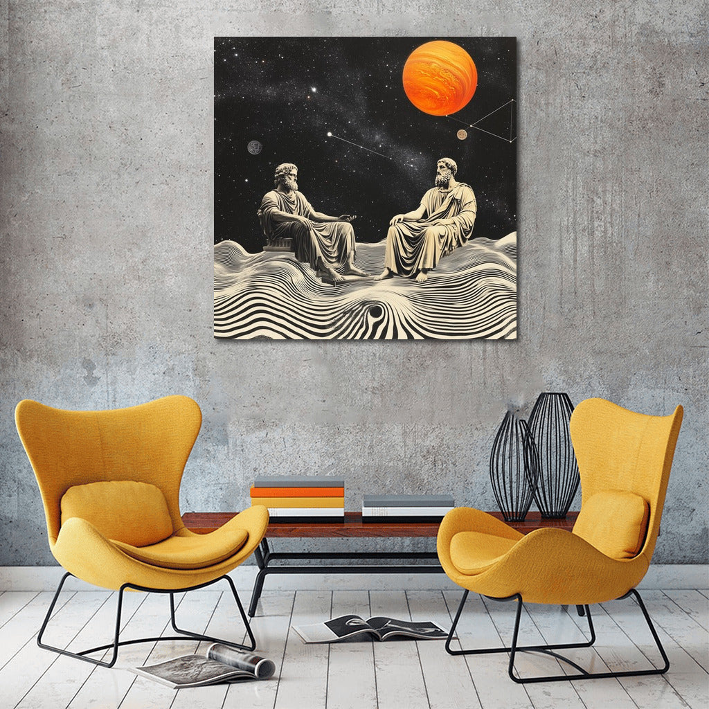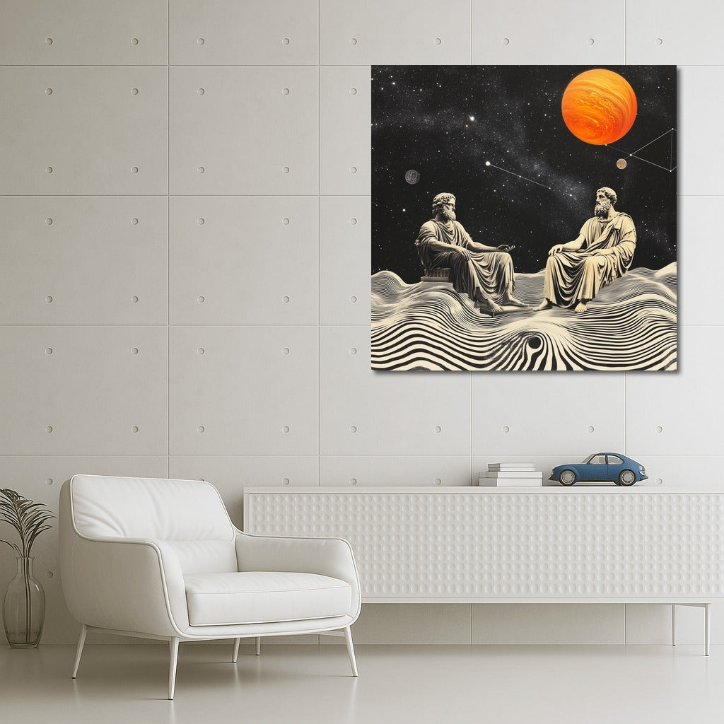 Abstract wall art: cosmic conversation of wise men among stars and planets. Thought-inspiring poster. See more from the collection: Mythology & Legends Art