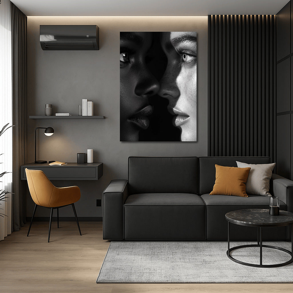 Impressive poster: meeting of shadows and light. Wall art reflecting the power and mystery of faces in black and white. See more from the collection: Black and White Art