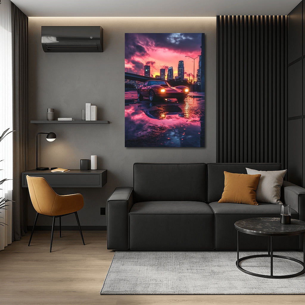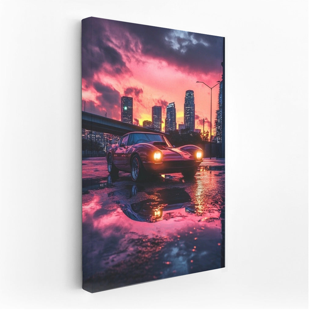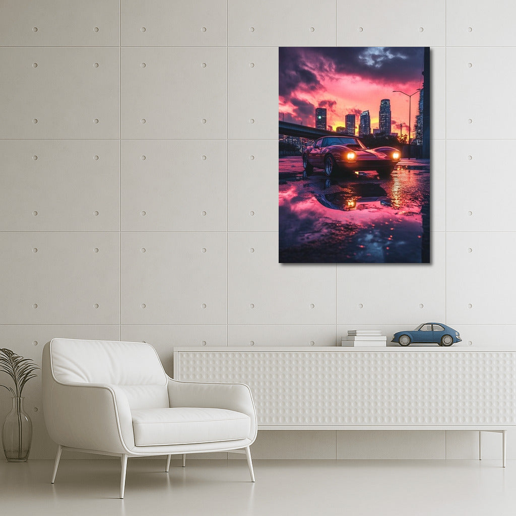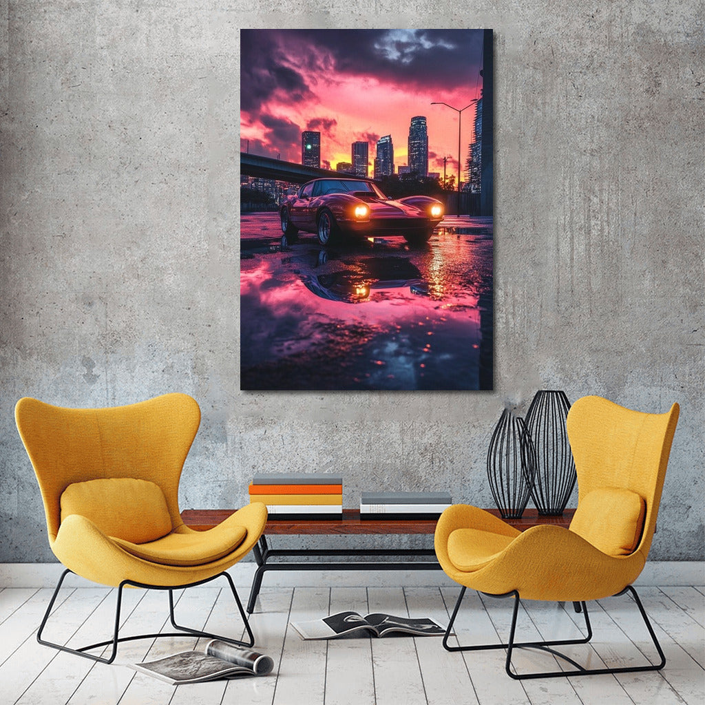 Sunset city glow: poster with vintage Chevrolet Corvette reflecting in puddles. Unique wall art for dreamers! See more from the collection: Chevrolet Art