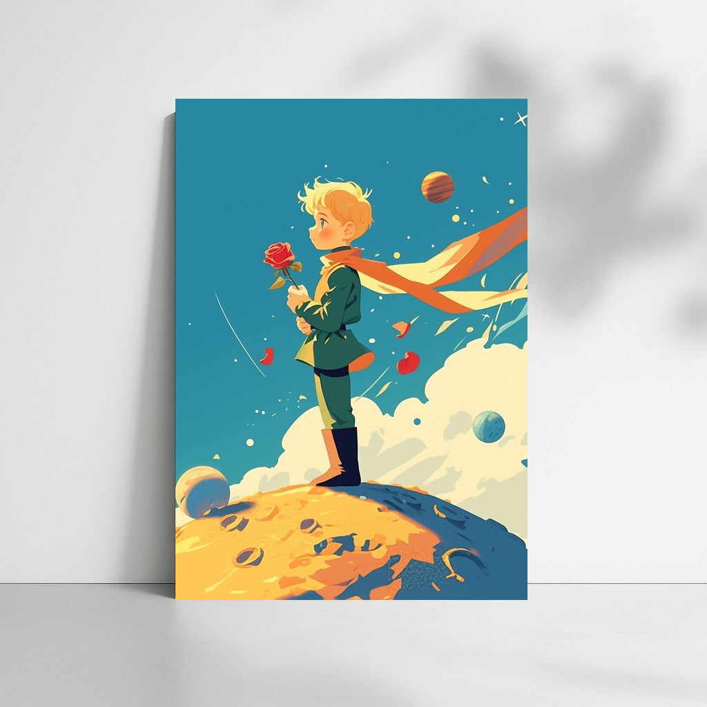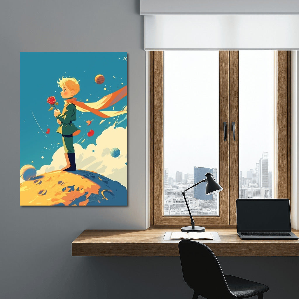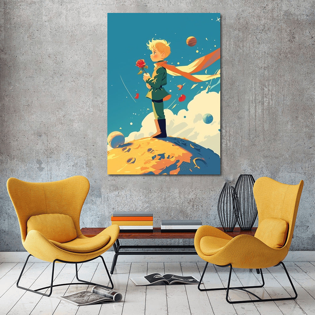 A young traveler and his flower in space. This painting is the perfect wall art for dreamers and fantasy lovers. See more from the collection: Cartoon Art
