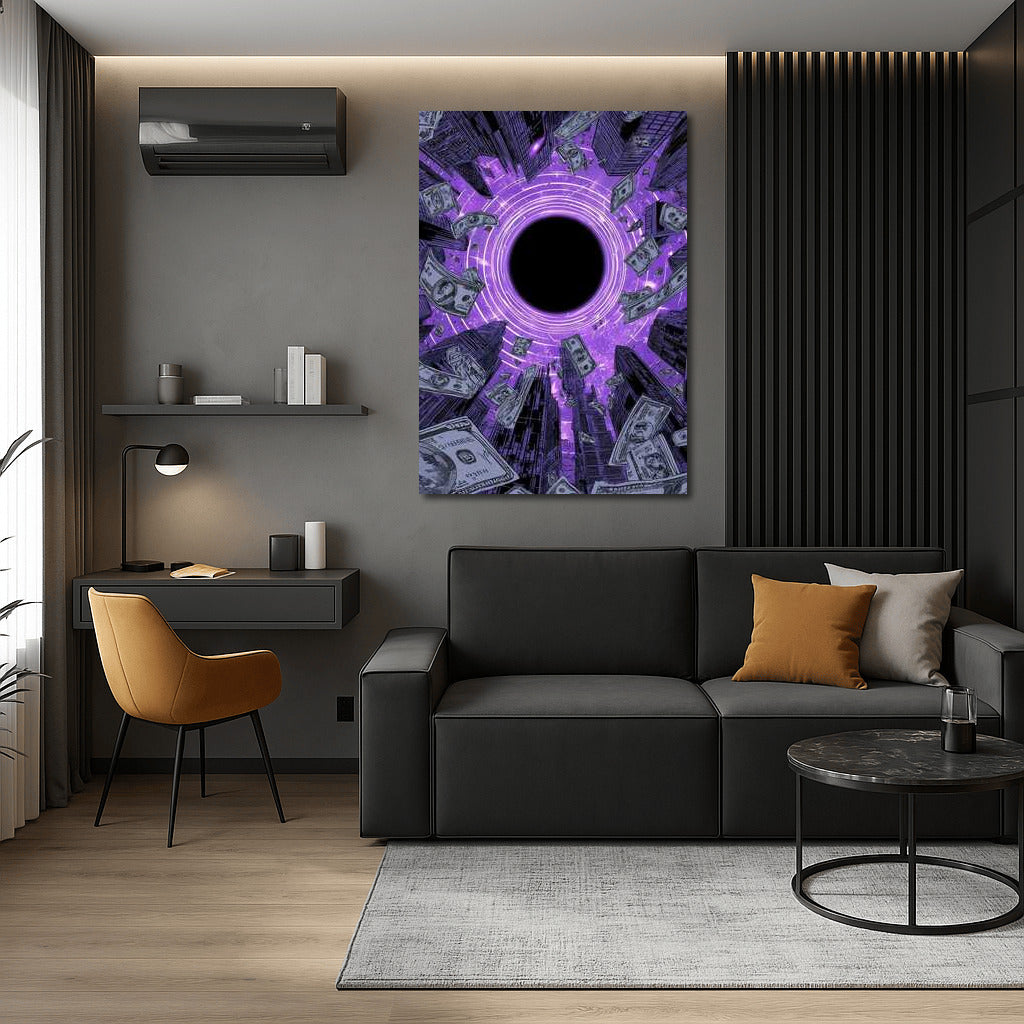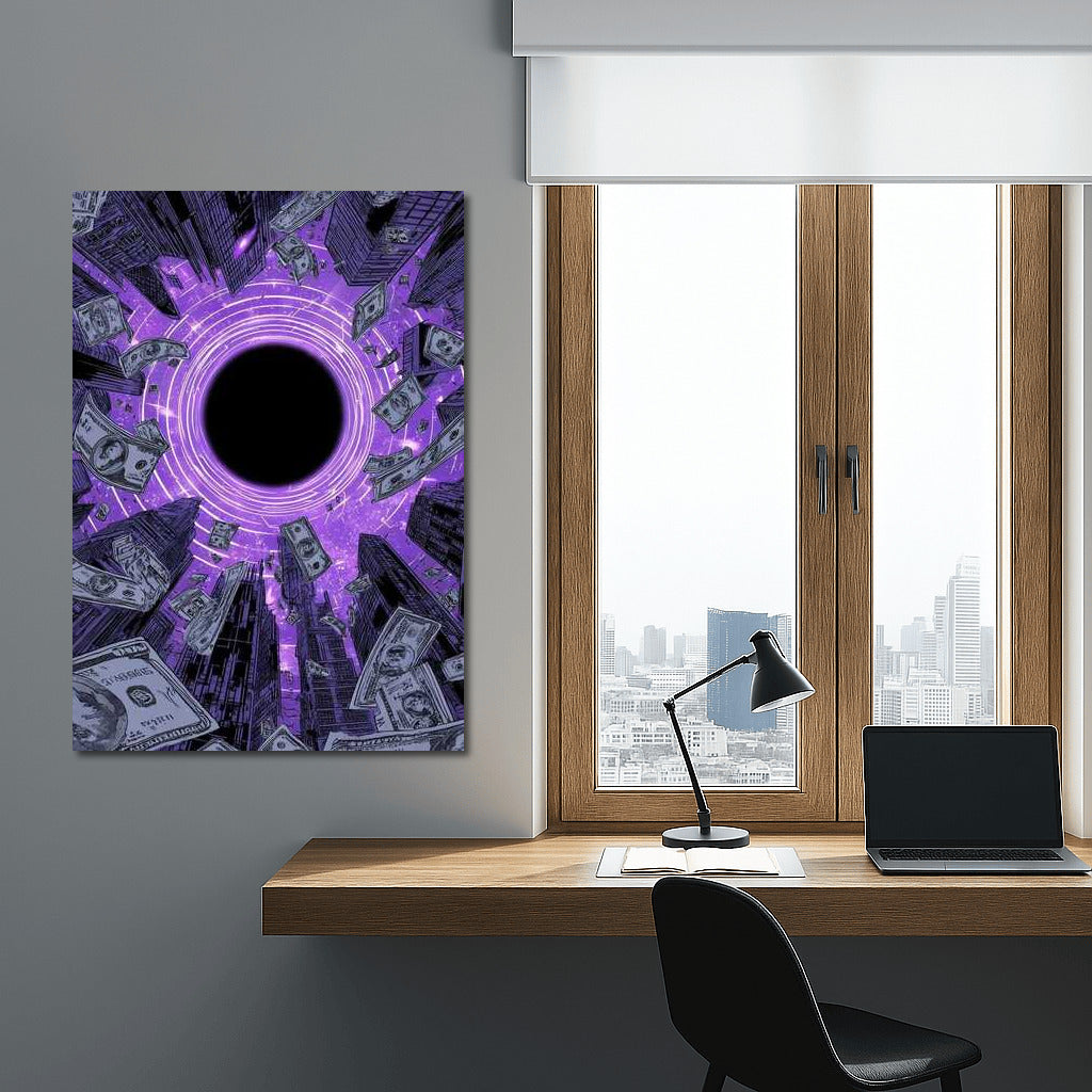 A swirl of purple horizons and floating banknotes. Wall art where money becomes part of a cosmic symphony. See more from the collection: Money Art