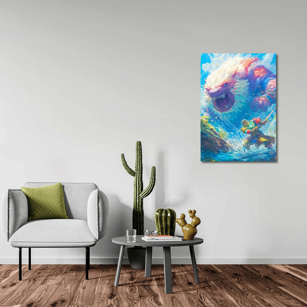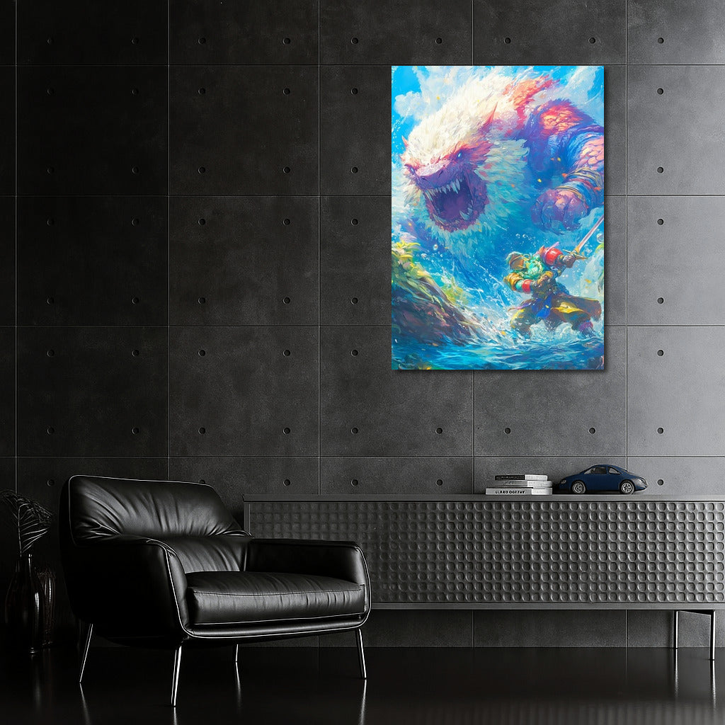 Epic battle: brave warrior vs. terrifying beast in a storm of colors. This poster will liven up your wall art space! See more from the collection: Mixed Wall Art