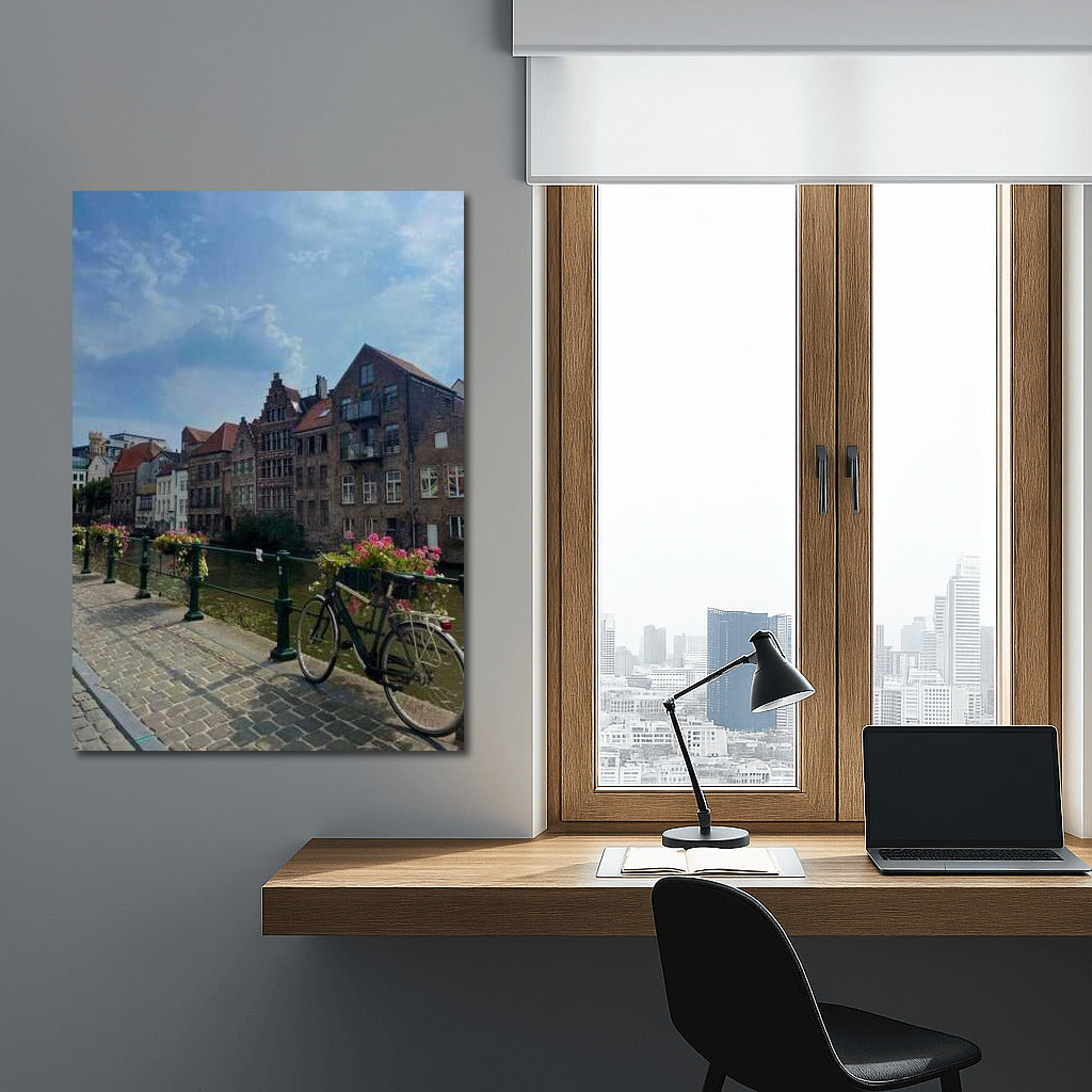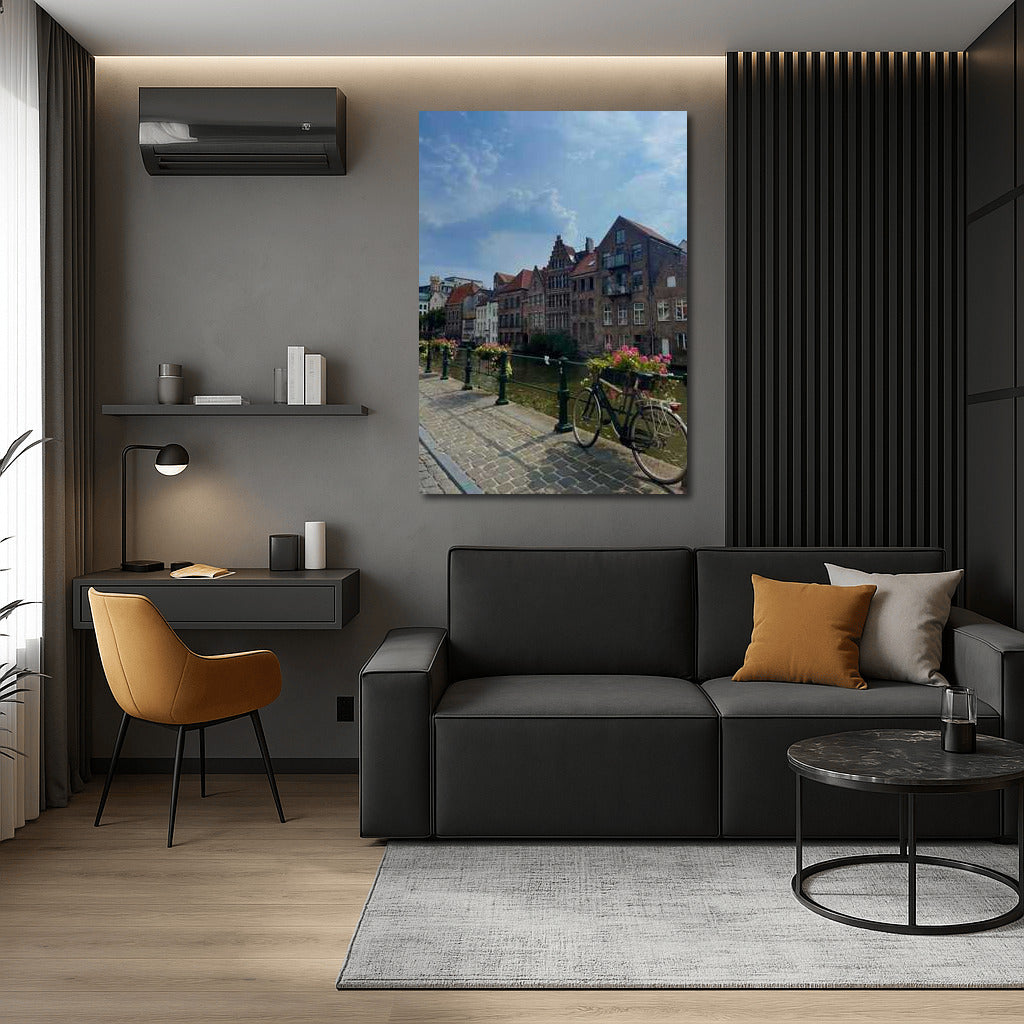 The charm of Belgium on a poster: a canal and historical buildings invite you to an atmosphere of coziness and tranquility. Wall art. See more from the collection: Belgium Art