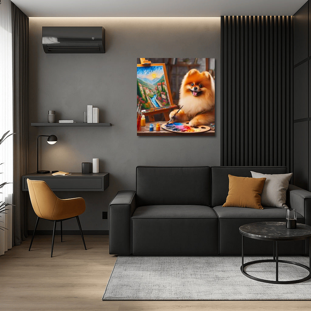 Adorable Creative Spitz: Wall art featuring a Pomeranian artist creating a masterpiece with brush and palette at an easel. See more from the collection: Animals Art