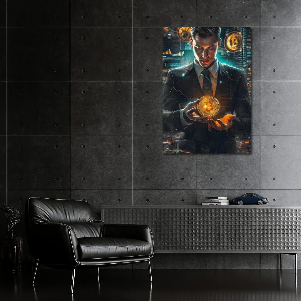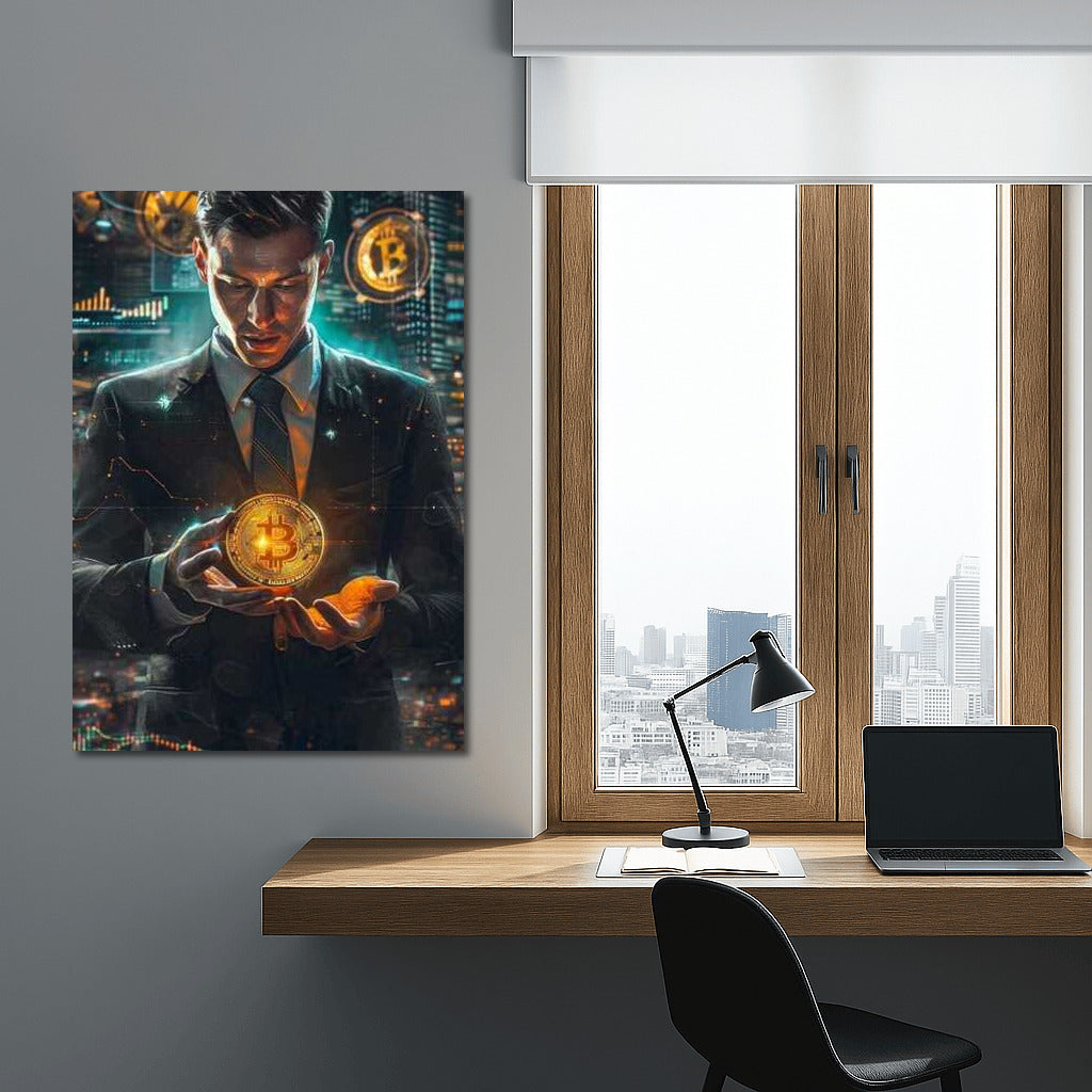 A mesmerizing painting of cryptocurrency shining in hands. Wall art for lovers of the digital future. See more from the collection: Cryptocurrency Art