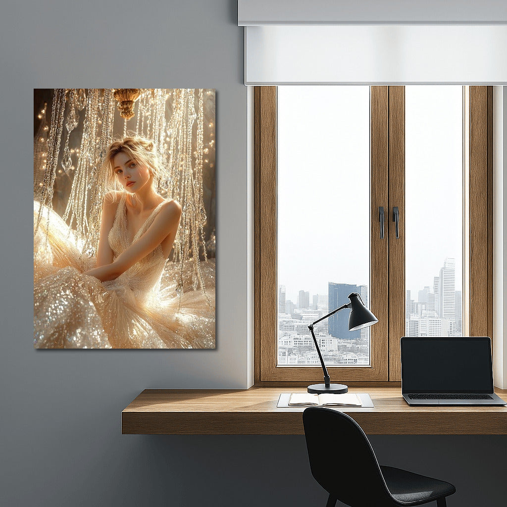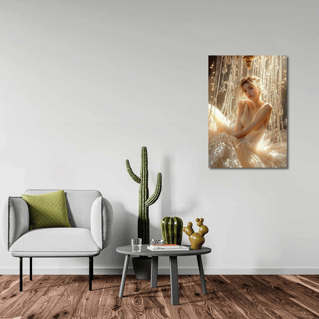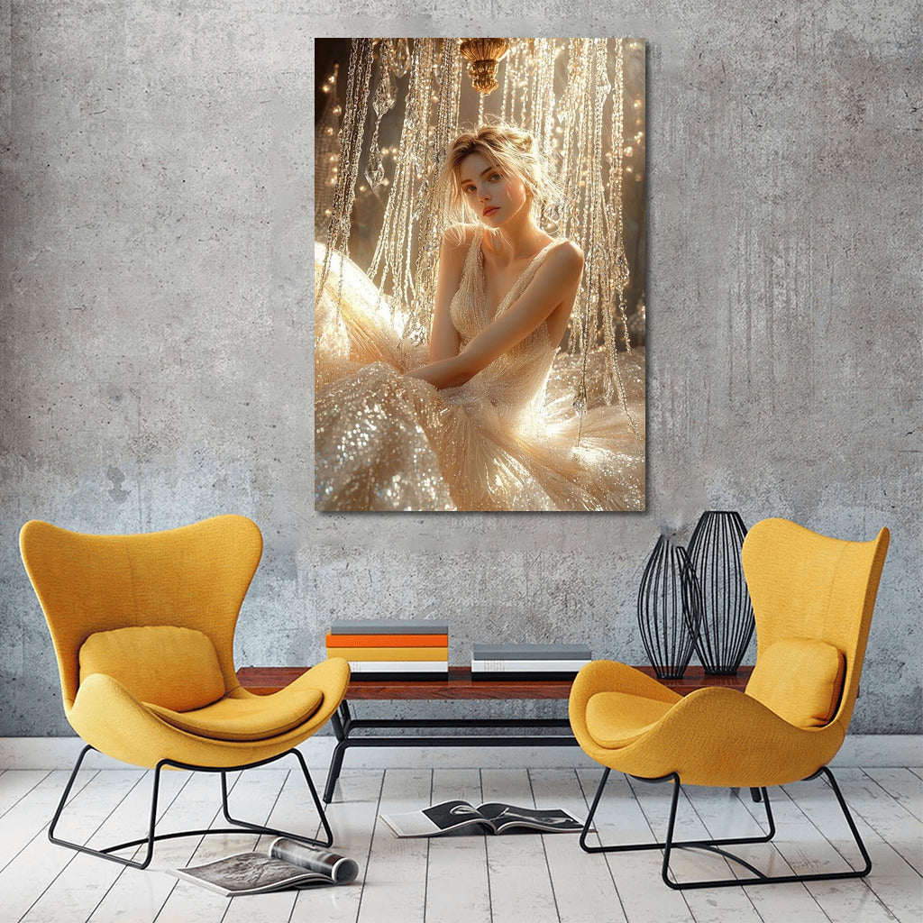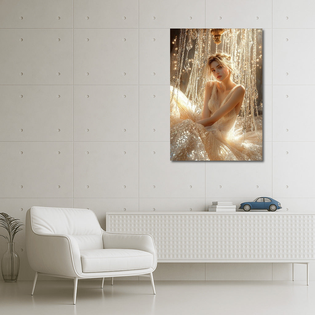 Magical poster: girl in the glitter and light of crystal curtains. Art that brings dreams to life on your walls. ✨ See more from the collection: Wall Art with Women
