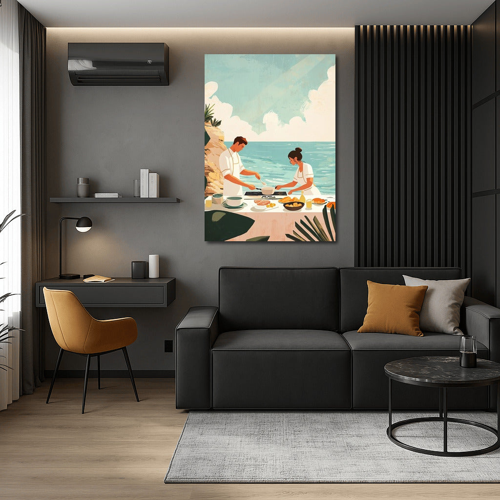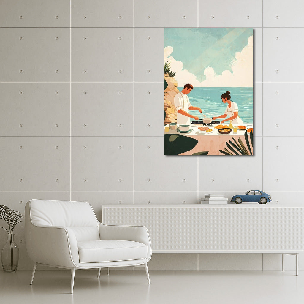 Summer Idyll: A poster of a couple by the sea creating gastronomic magic. Perfect wall art for daydreaming! See more from the collection: Mixed Wall Art