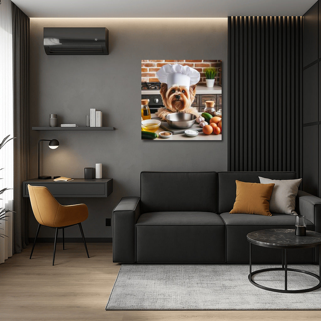 Yorkshire Terrier in a chef's hat creates culinary wonders in the kitchen. Poster for lovers of humor and wall art! See more from the collection: Animals Art