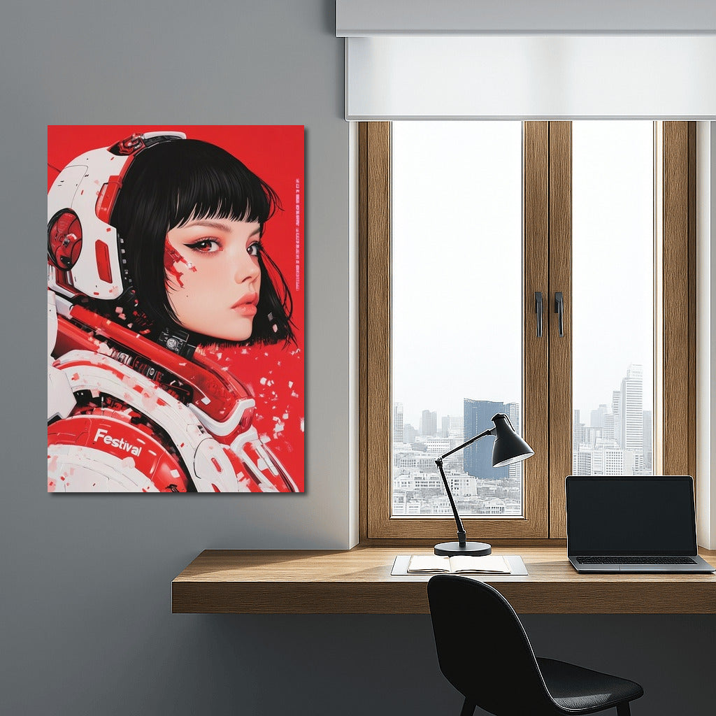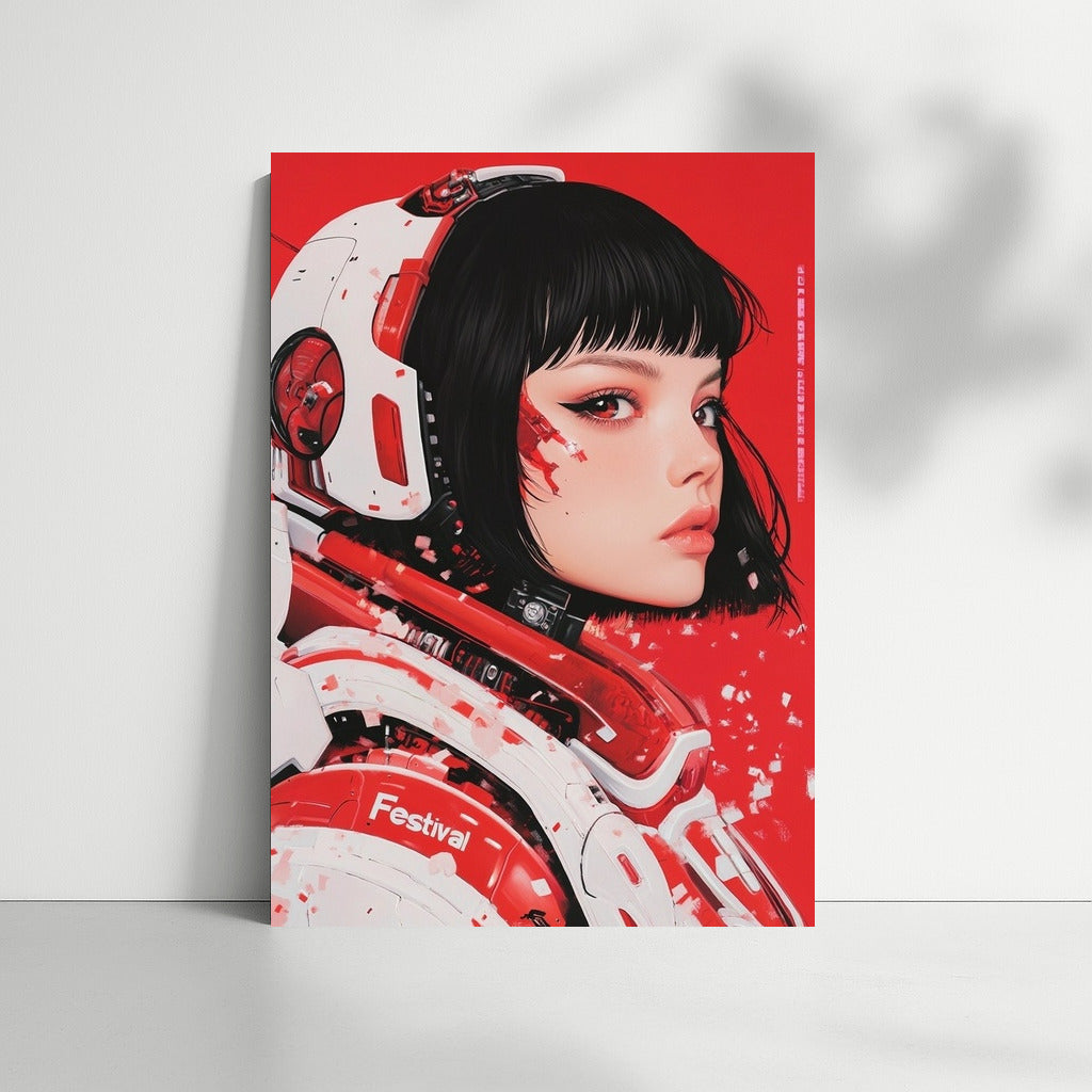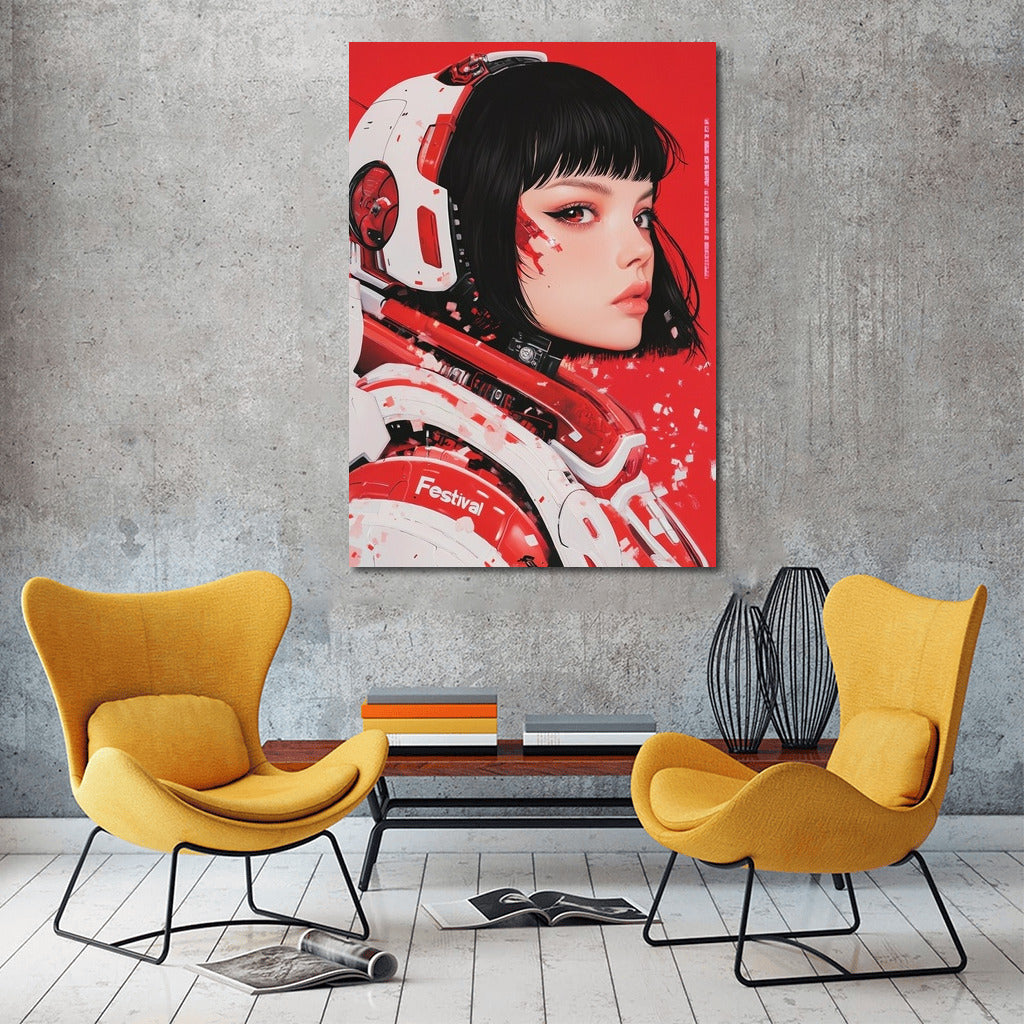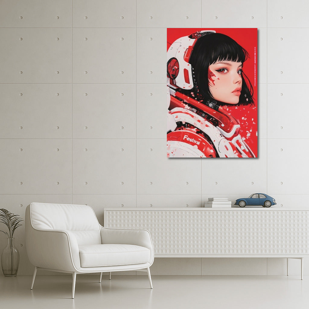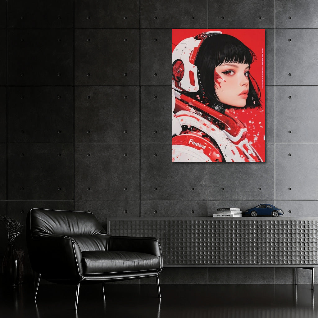 Futuristic poster with a cyber heroine in bold red and white colors. Wall art that brings life to a modern interior. See more from the collection: Mixed Wall Art