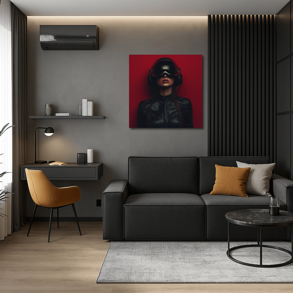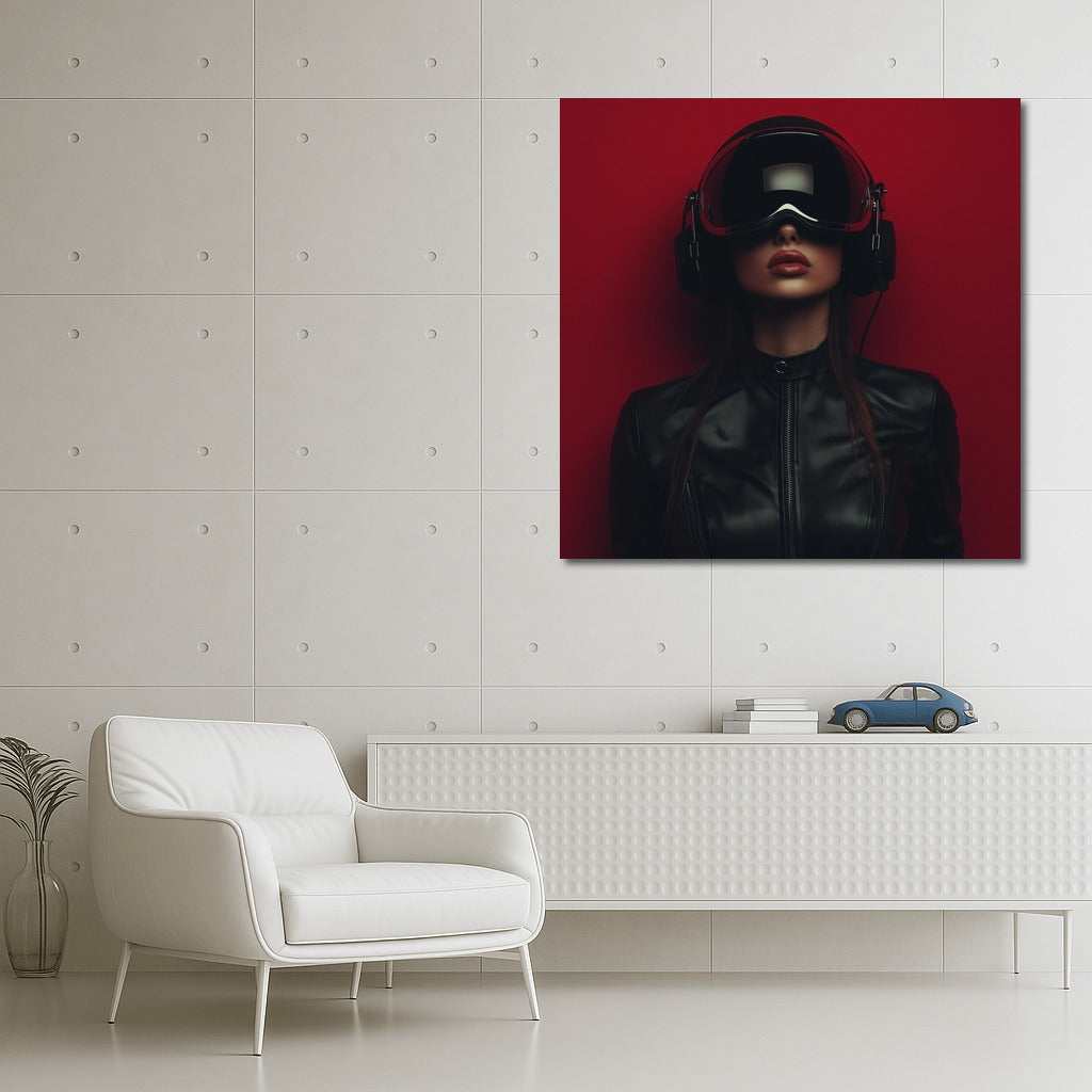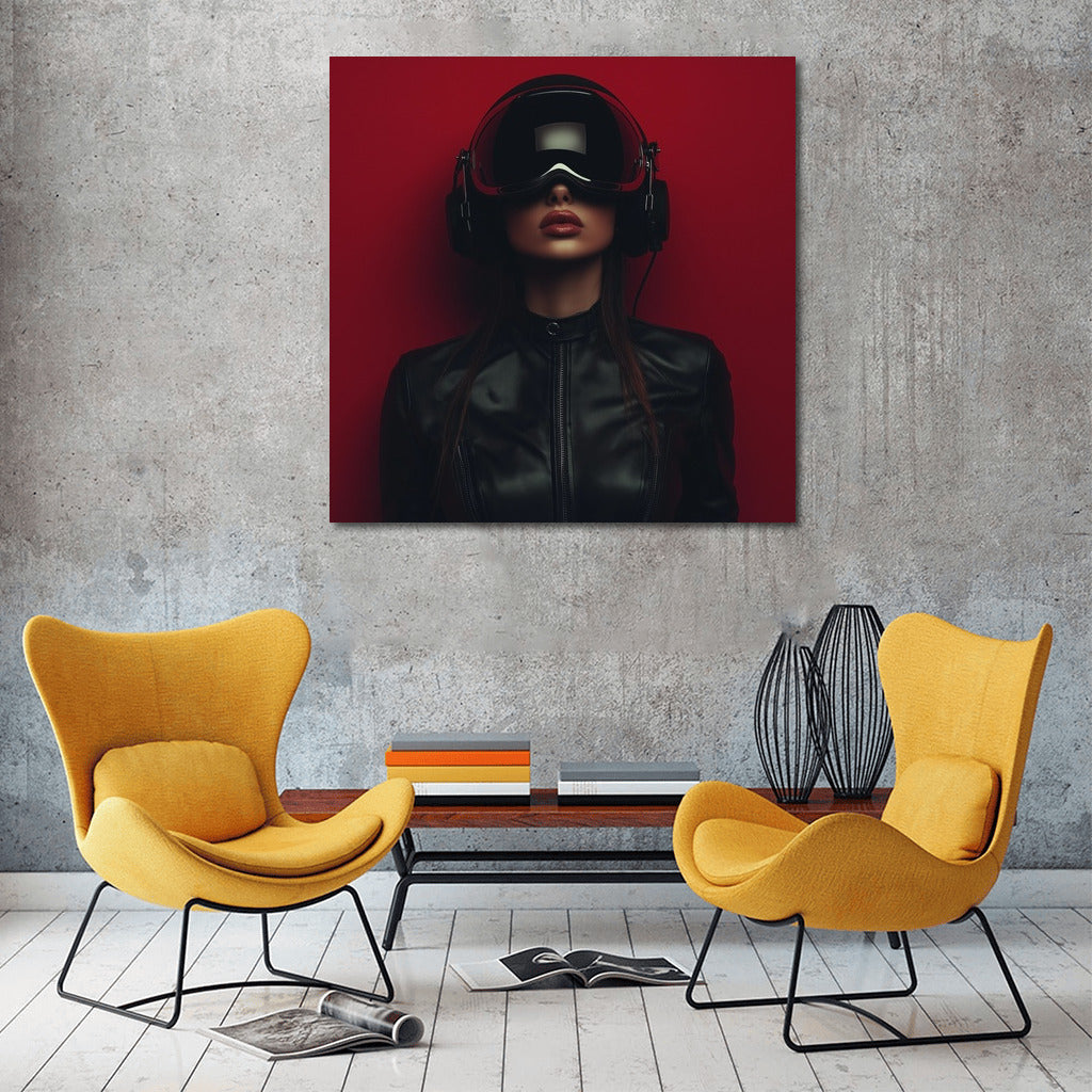 Virtual world of wall art: mysterious figure in a helmet on a bright background. Modern poster for a stylish interior. See more from the collection: Mixed Wall Art