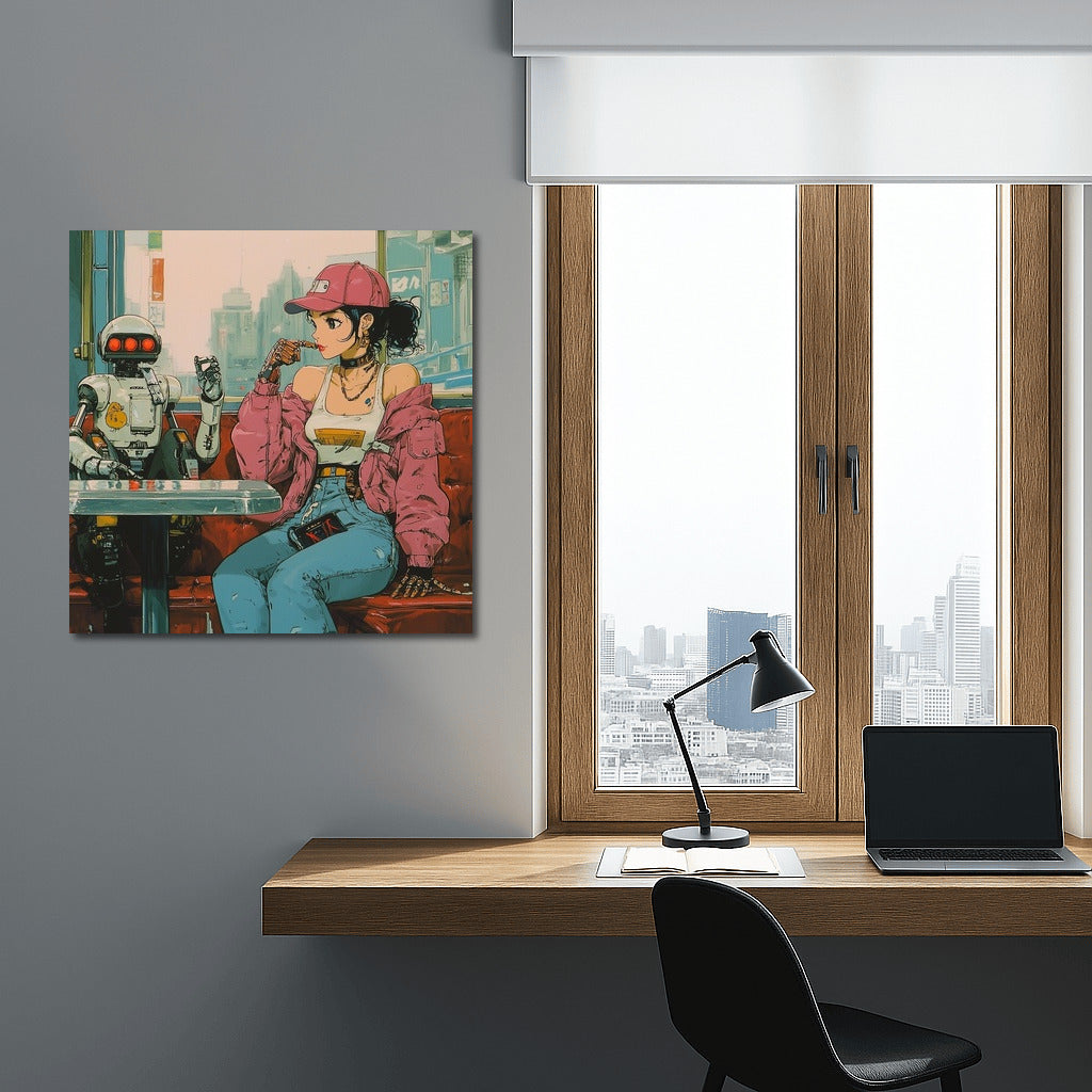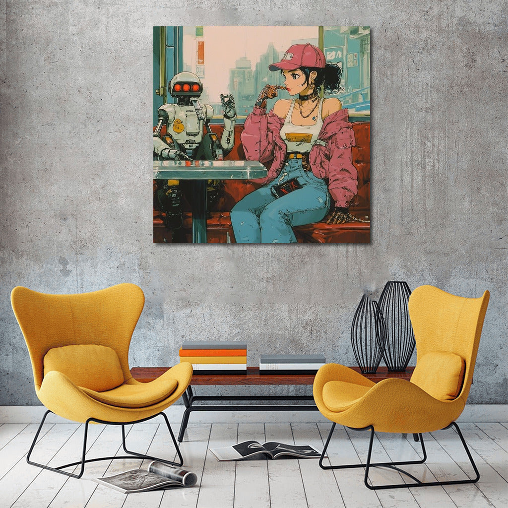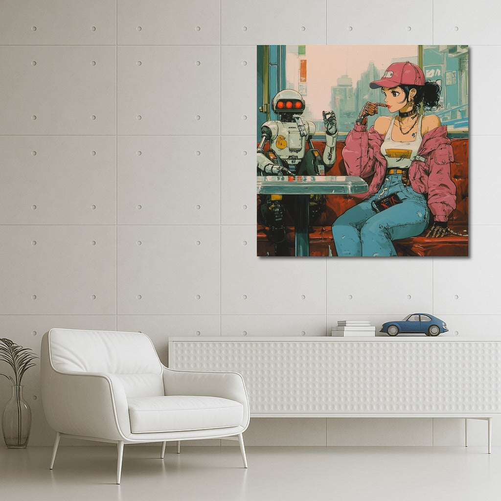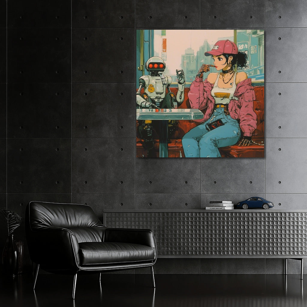 Urban aura: girl and robot having coffee. This poster will liven up your space and add a touch of futuristic charm! See more from the collection: Mixed Wall Art