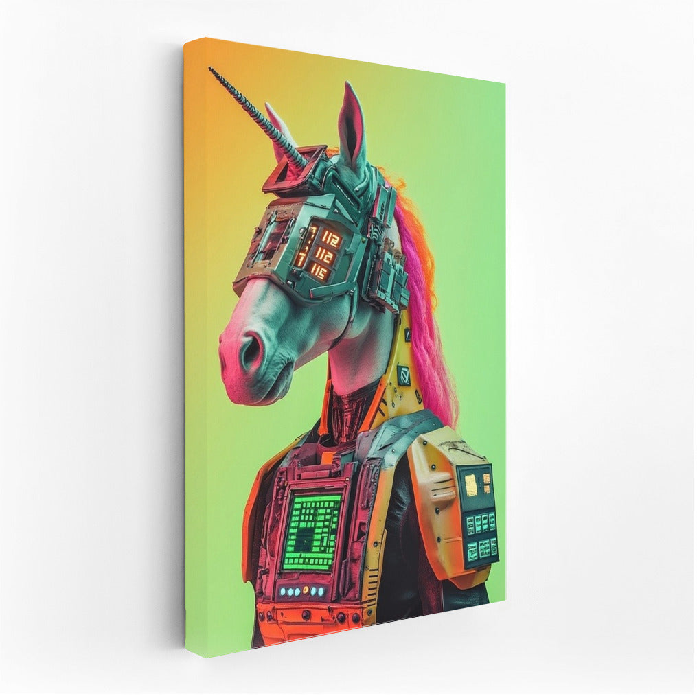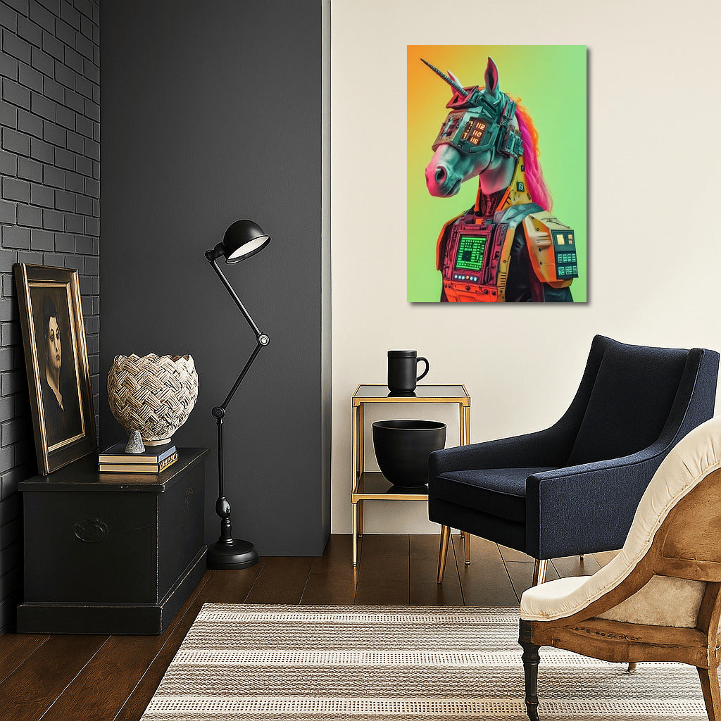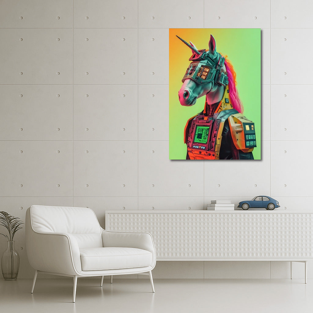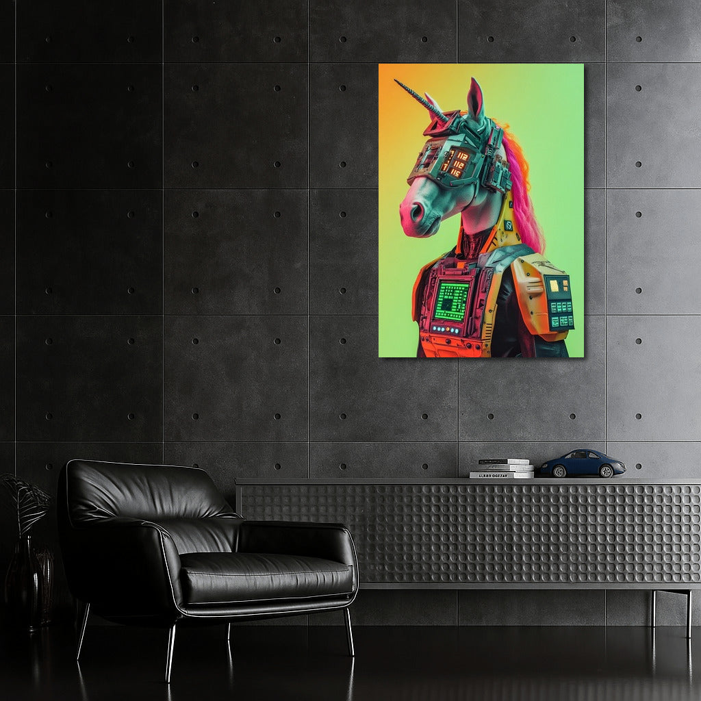Futuristic cyber-unicorn is a bright accent for your interior. The original poster will enliven any space! See more from the collection: Futurism Art