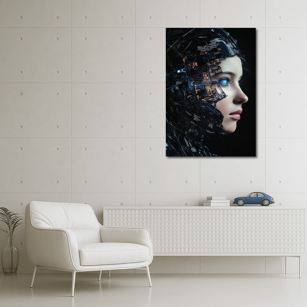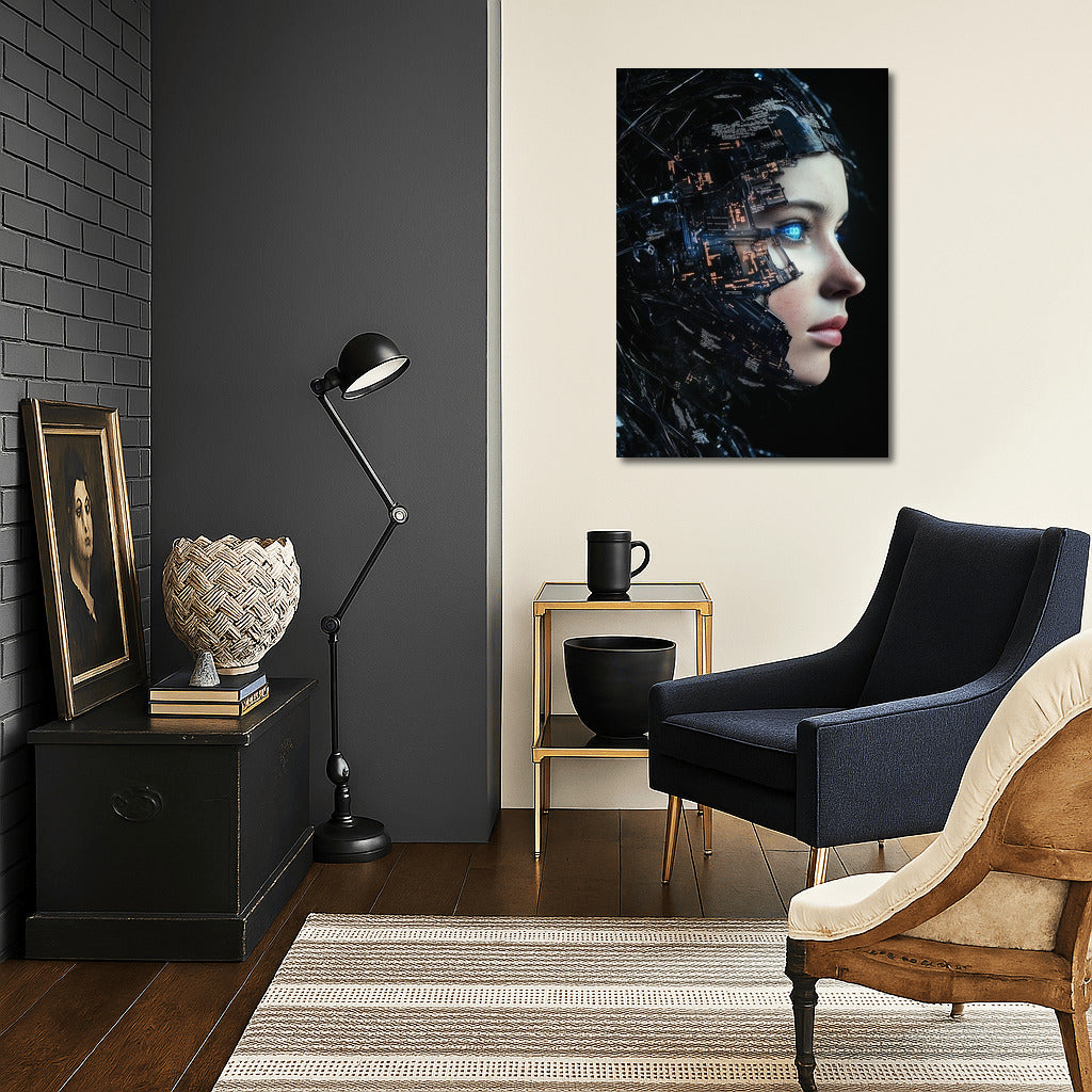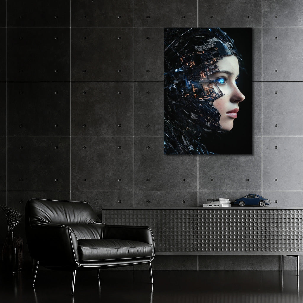 Futuristic wall art: the synthesis of man and technology. Dive into the world of cyber aesthetics with this unique poster! See more from the collection: Mixed Wall Art