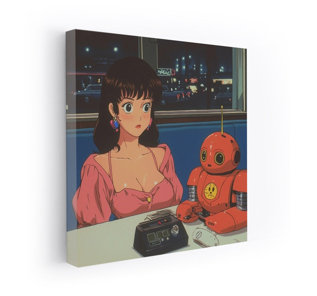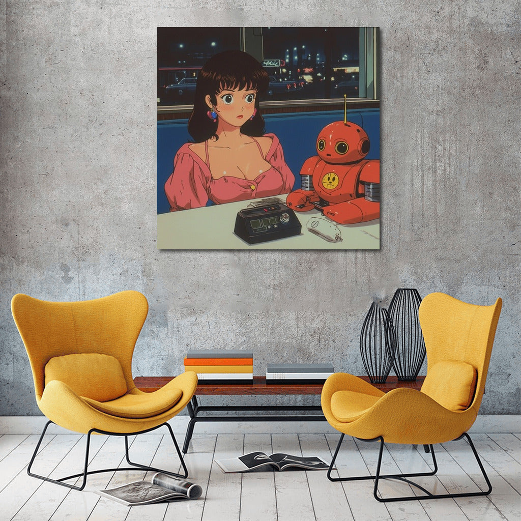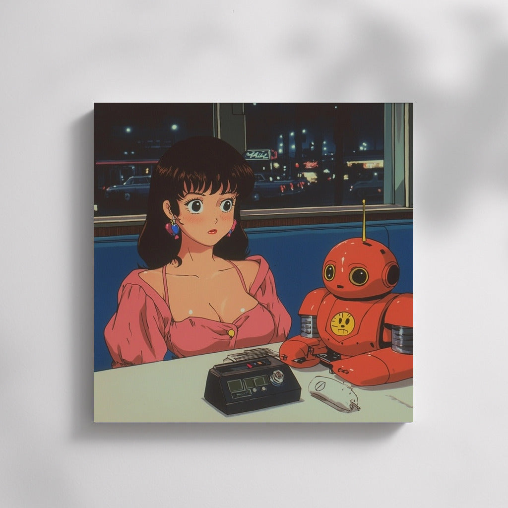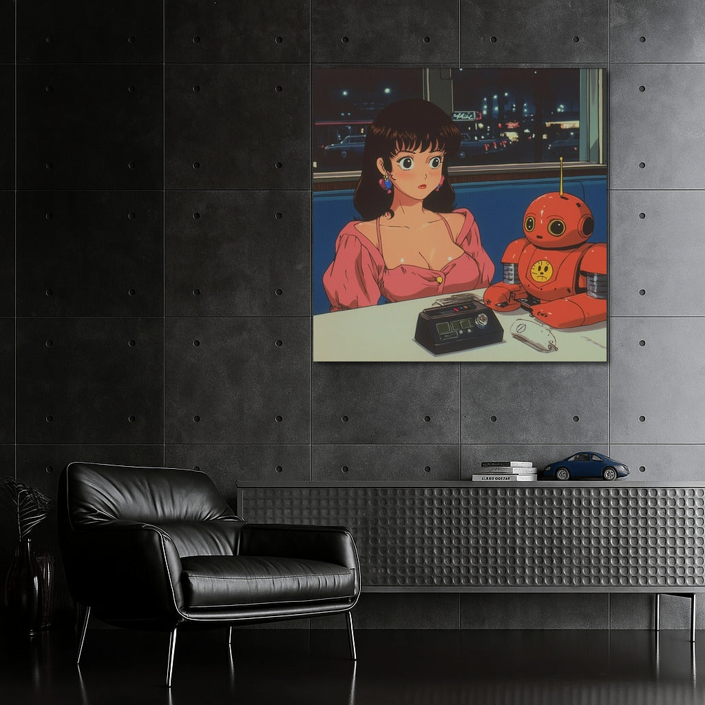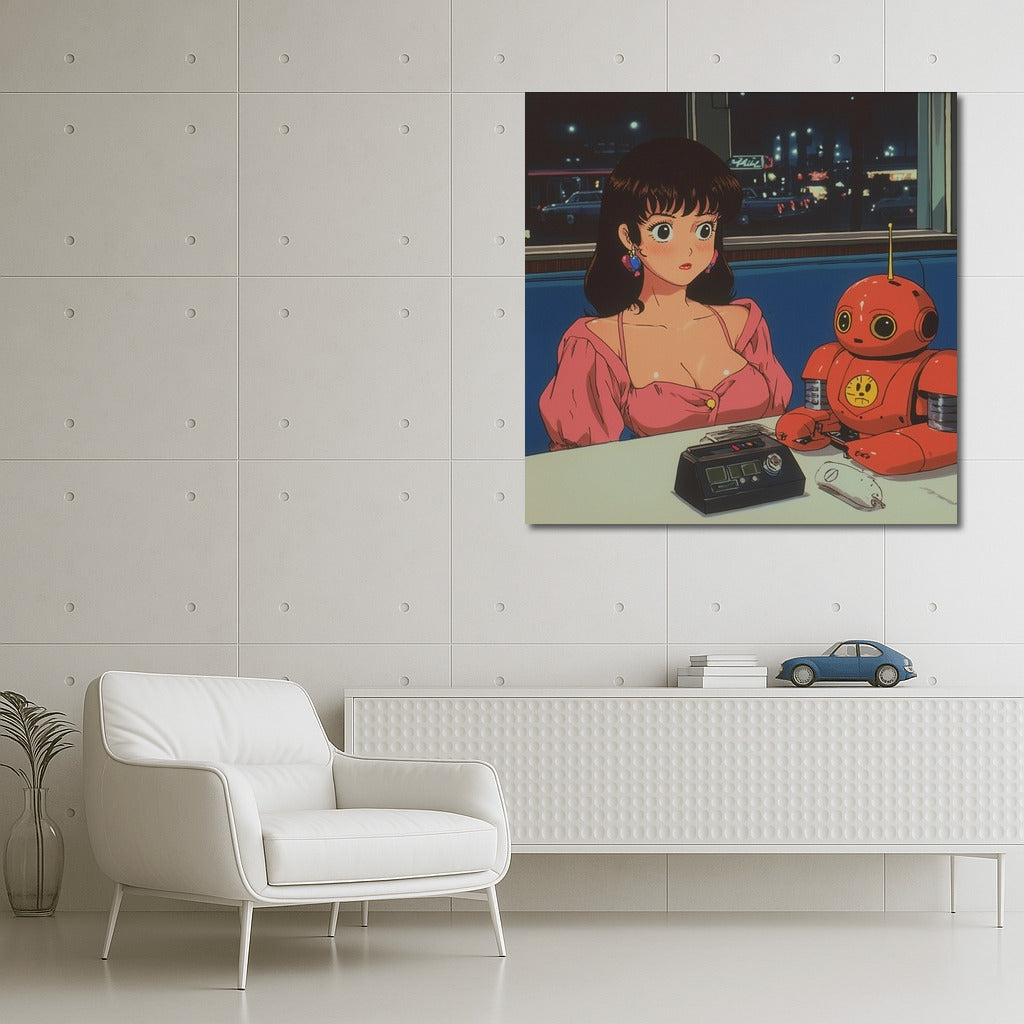 The evening atmosphere of a cafe comes to life in this poster with a mysterious meeting between a man and a robot. Wall art of the future! See more from the collection: Anime & Manga genres Art
