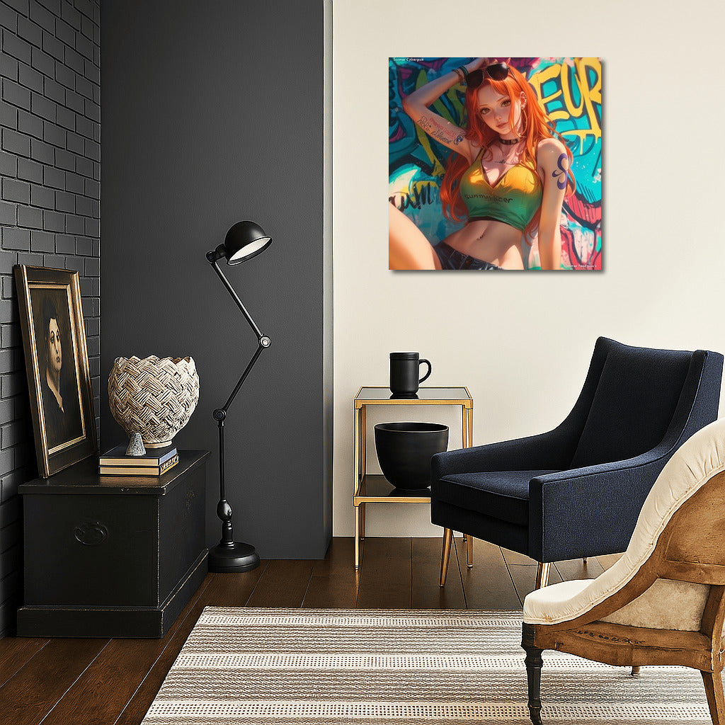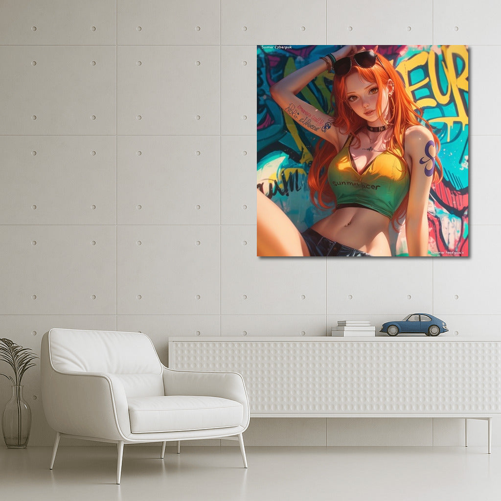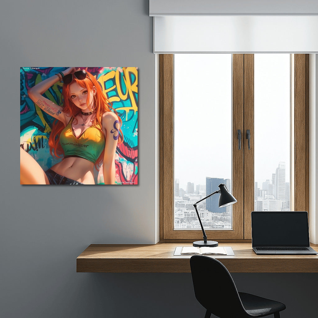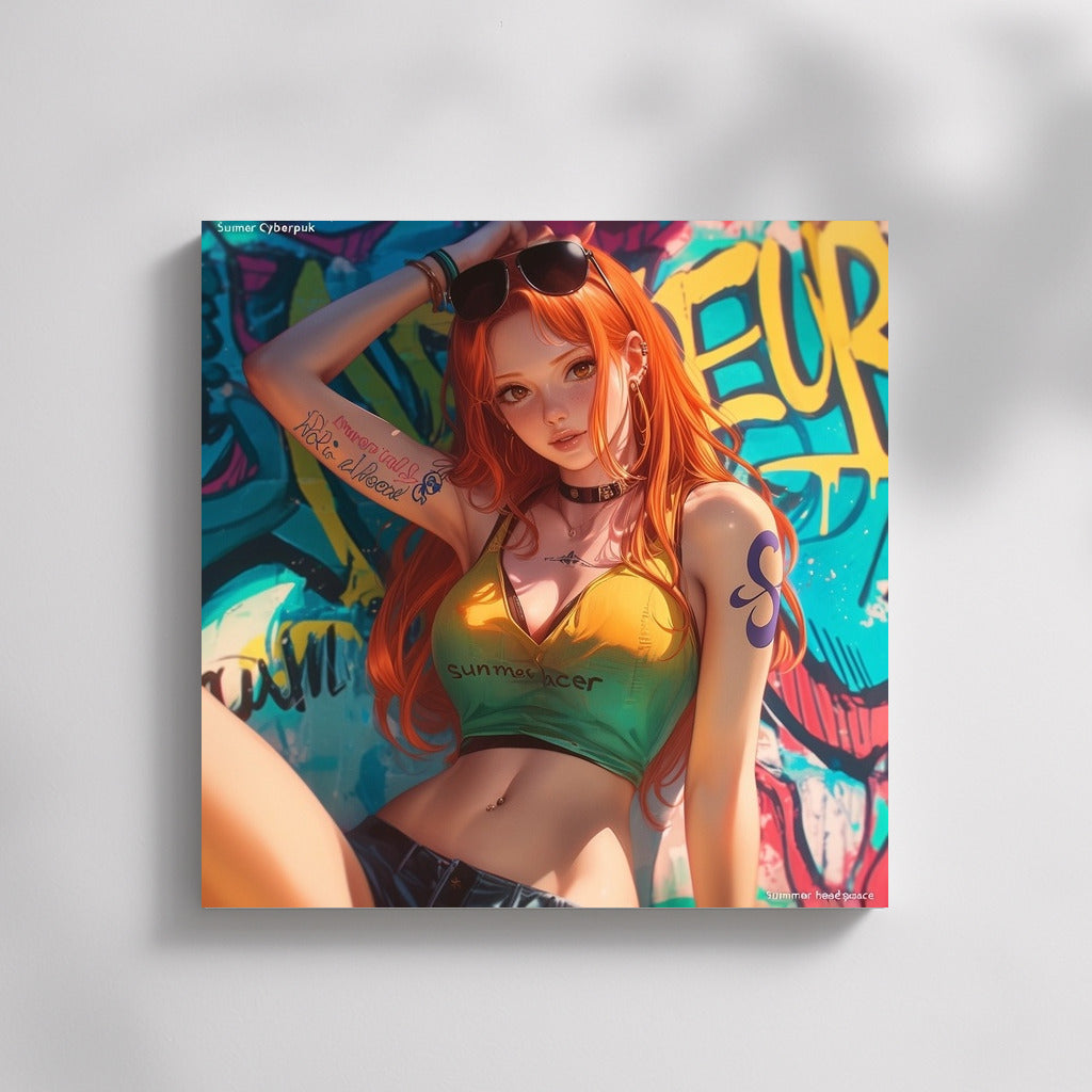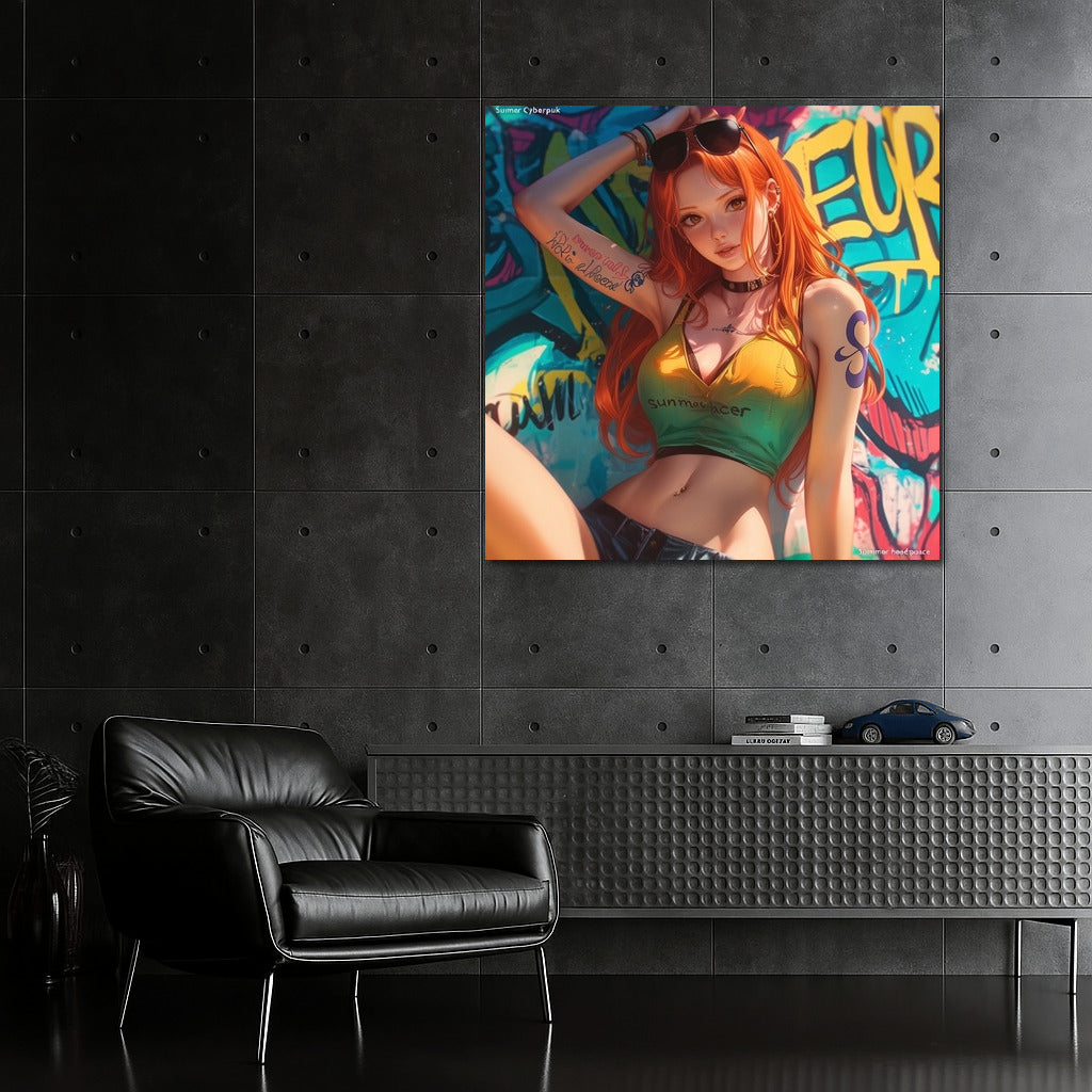 Summer mood in cyberpunk style: a bright poster with graffiti art and a mysterious figure. A wall temptation for your space! See more from the collection: Anime & Manga genres Art