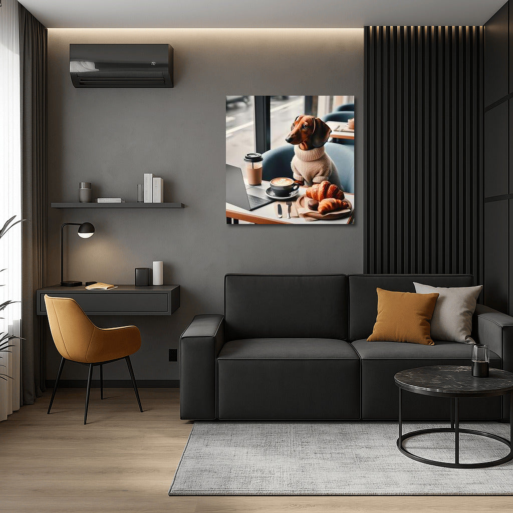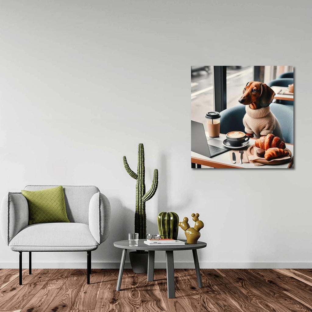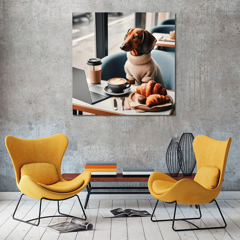 Dachshund in a Sweater: Morning Coffee and Croissants for a Cozy Interior Wall Art