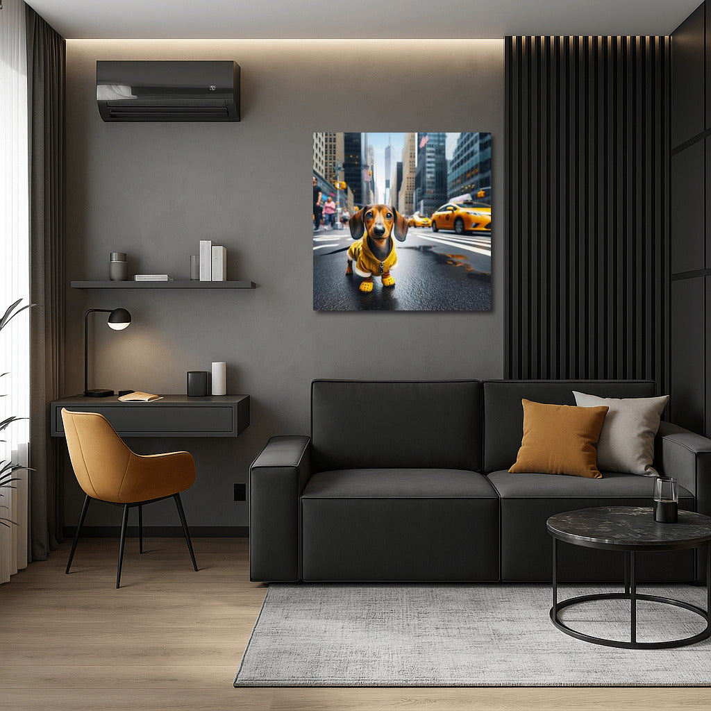 Dachshund in the City: Fashionable Dog and Yellow Taxis Wall Art