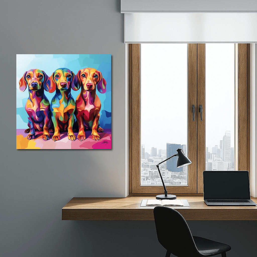 Bright wall art: three colorful dachshunds on a poster. Will add positivity and energy to any interior! See more from the collection: Dachshund Art