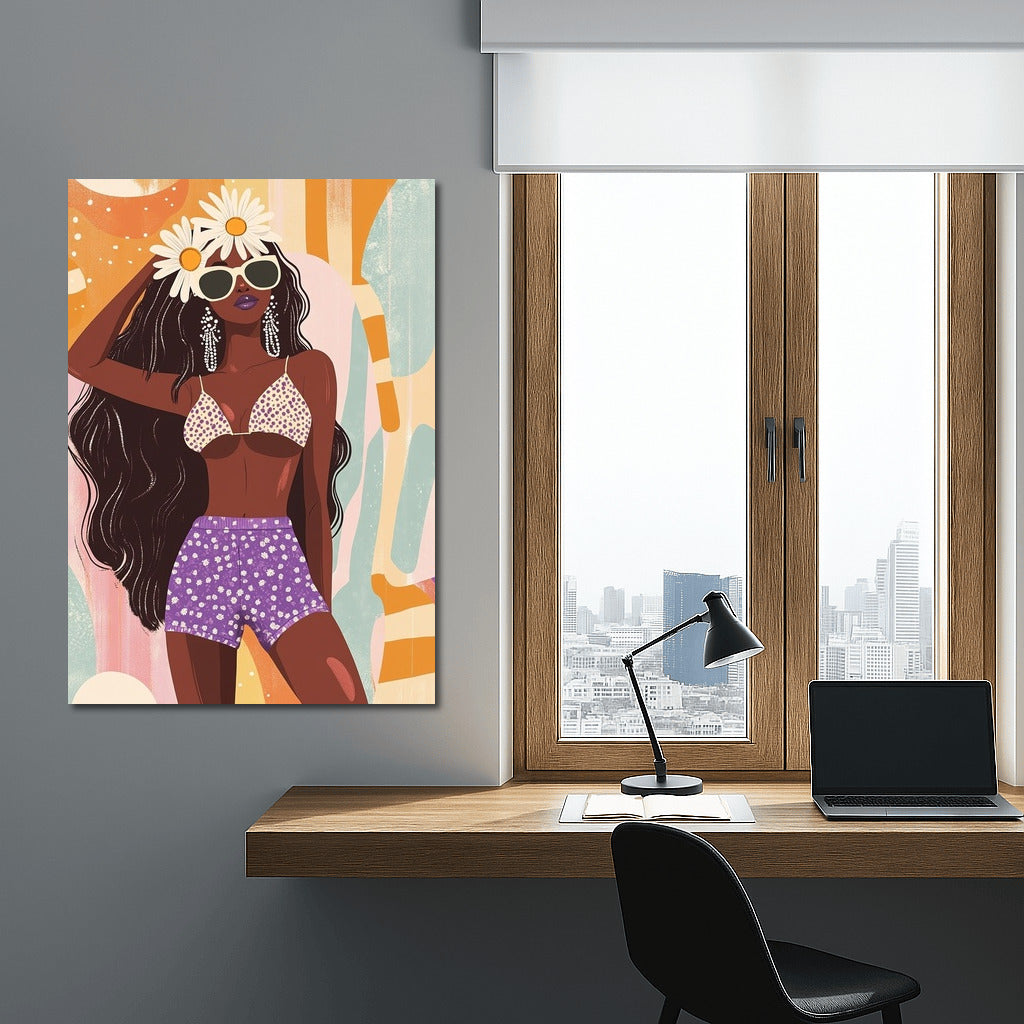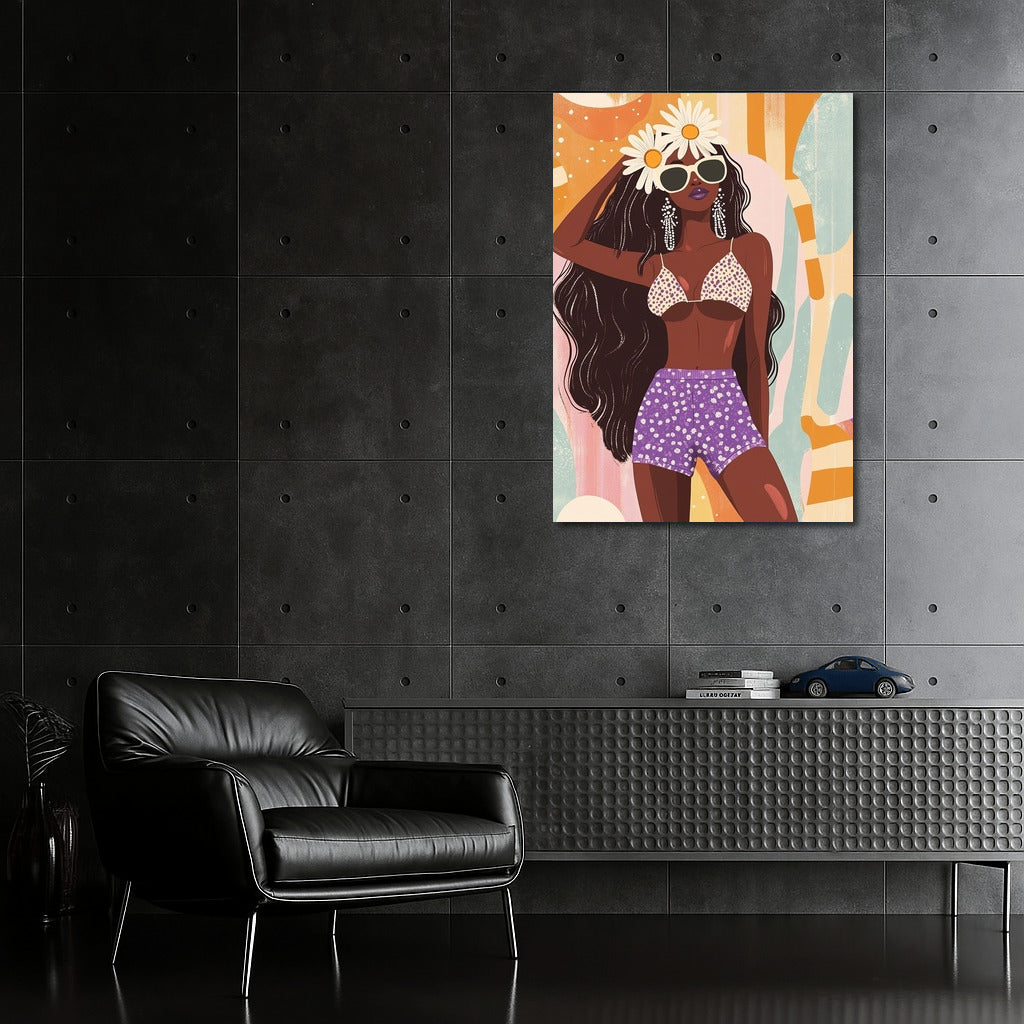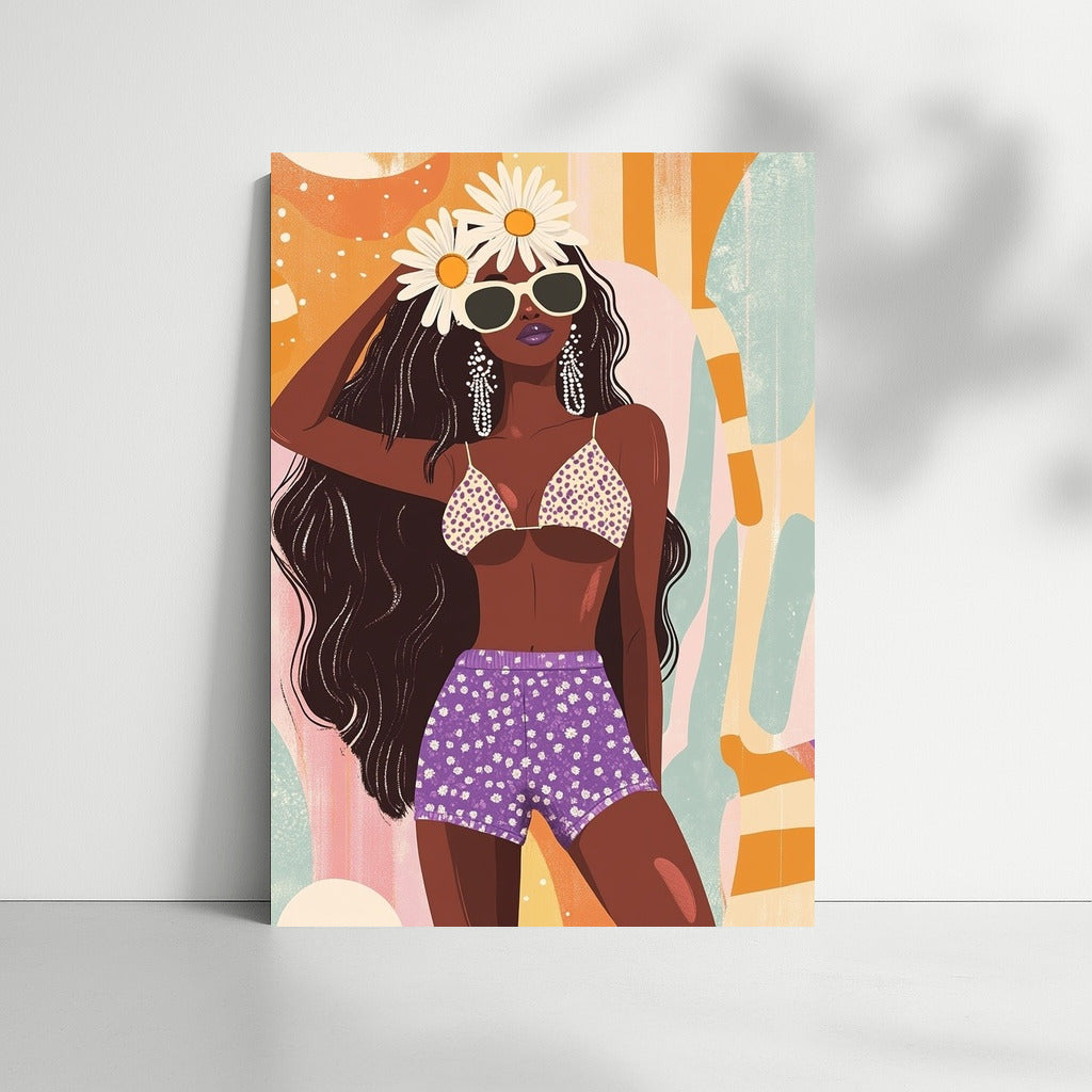 A bright painting with a fantasy character: glasses, daisies and a sea of summer mood. A poster for stylish wall art. See more from the collection: Mixed Wall Art